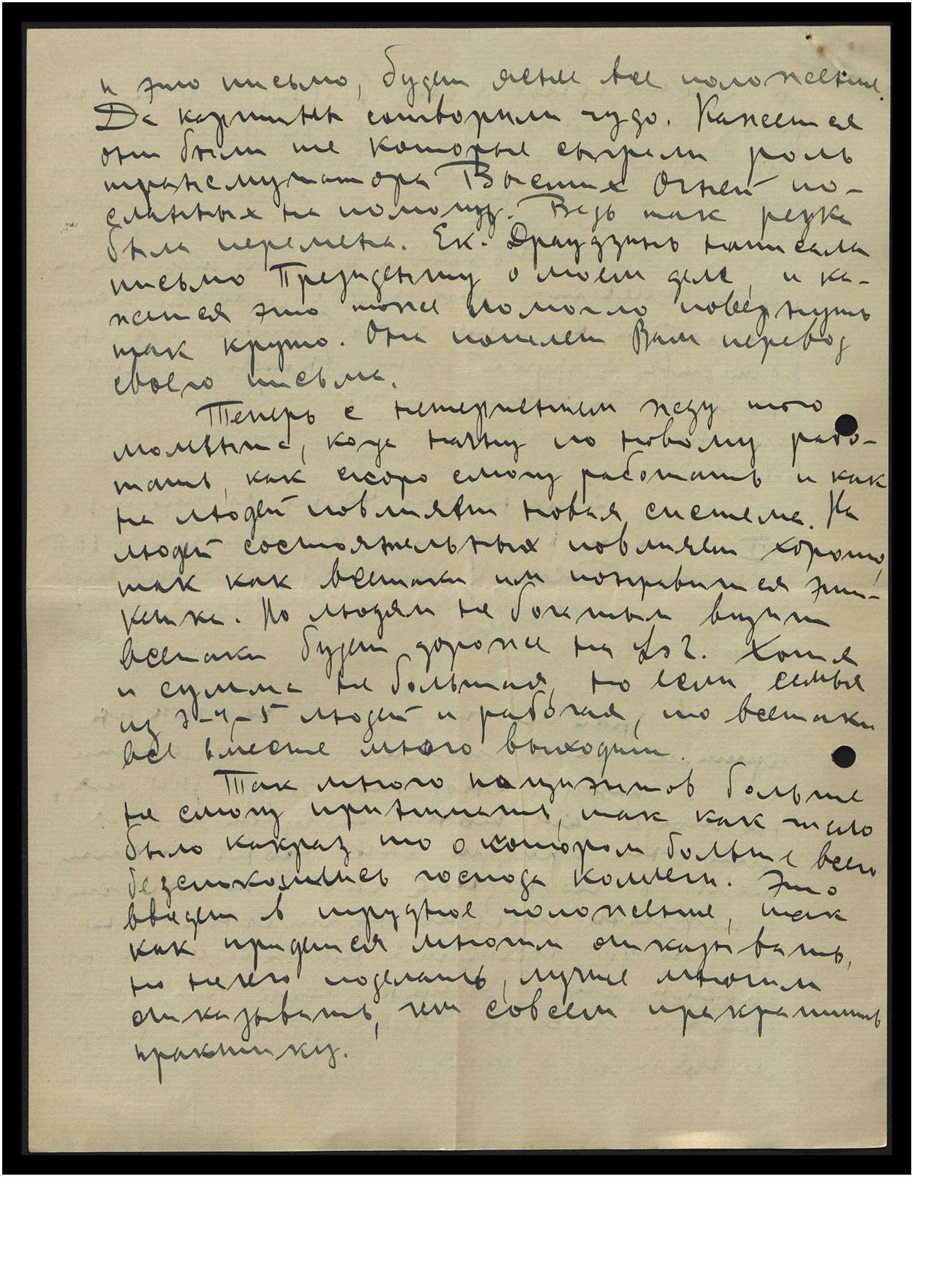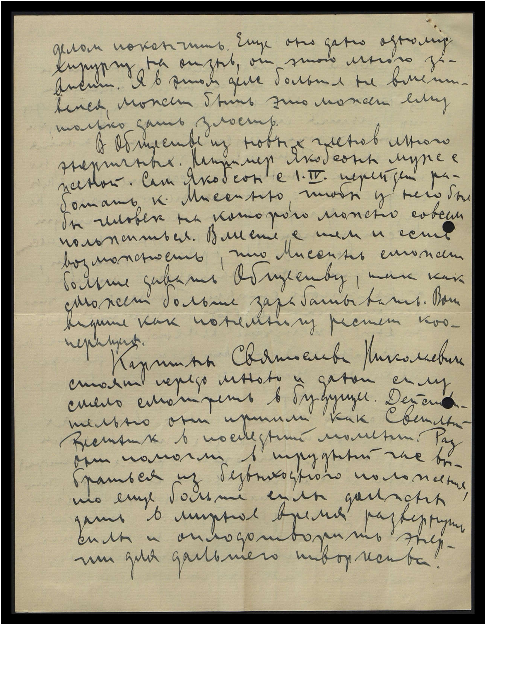 У Р[ихарда] Я[ковлевича] материальные обстоятельства неважные, и с двумя детьми, и женой трудно пробиться. И должен ясно сказать, что нервы его супруги совсем пошатнулись, и это действует так разрушительно на всю семейную жизнь, и на всё творчество, так как они могли бы быть сотрудниками на литературном поле, а теперешние обстоятельства это ликвидируют ниже нуля. Миссинь хочет на взморье взять большую дачу и тогда попросить Р[ихарда] Я[ковлевича] со всей семьёй и на всё лето в гостях. Но Р[ихард] Я[ковлевич] уже противляется. Но приложу все свои силы, чтобы его противление если и не смягчить, то ломать. Всё равно, надо действовать так, чтобы это было в пользу Общего Блага. А оговорка, что могу жить только на то, что зарабатываю, совсем не жизнеспособна. Ведь все мы работаем для Дела Вел. Вл., и не может совсем быть речи — это твоё, это моё, а это его. Всё общее и должно экономно быть использовано для Вел. Дела. Также объяснял, что Р[ихард] Я[ковлевич] будет ответственен, что его работа не выйдет из