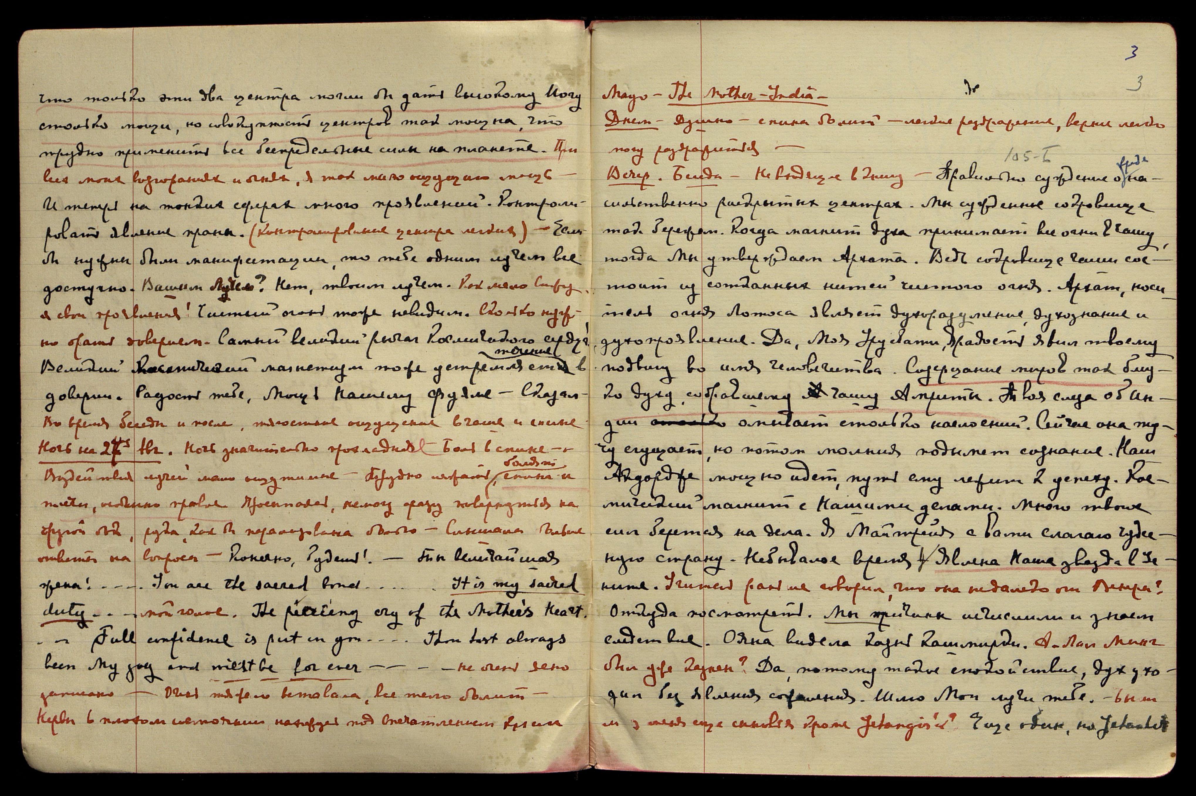 Ночь на 27-е августа. Ночь значительно прохладнее. Боль в спине. Воздействия лучей мало ощутимые. Трудно лежать, болят спина и плечи, особенно правое. Просыпаясь, не могу сразу повернуться на другой бок, рука как бы парализована болью. Слышала больше ответы на вопросы. "Конечно, будешь! Ты величайшая жена!.. You are the sacred bond [англ.: Ты посвящённая]"... "It is my sacred duty [англ.: Это мой священный долг]..." − мой голос. "The piercing cry of the Mother`s Heart [англ.: Мирный крик Материнского Сердца]... Full confidence is put in you [англ.: полное доверие выражаю тебе]... Then has always been my joy and will it be for over [англ.: Тогда всегда была моей радостью и будет это навсегда]..." − не очень ясно записано. Очень тяжело вставала, всё тело болит. Нервы в плохом состоянии, нахожусь под впечатлением книги [слово неразборчиво] "The Mother India [англ.: Мать Индия]".