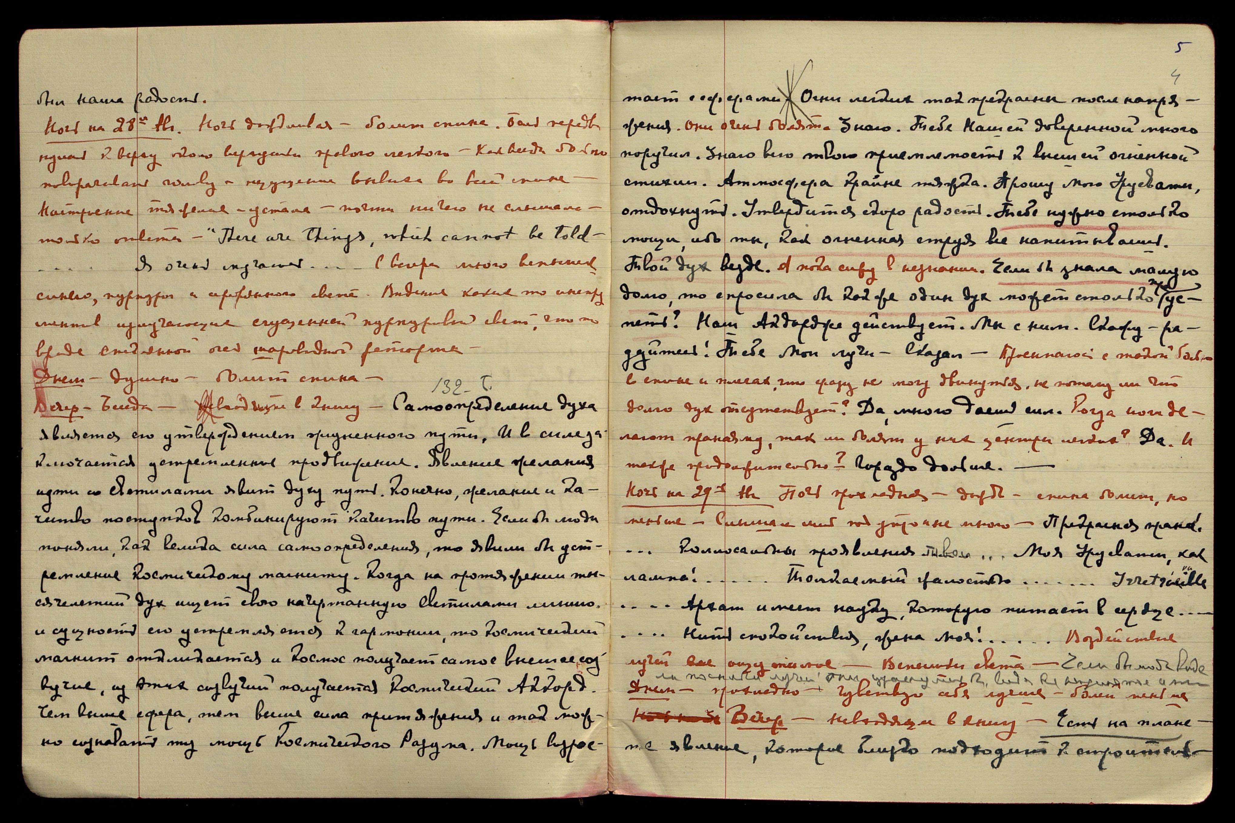 Ночь на 28-е августа. Ночь дождливая, болит спина. Боль передвинулась кверху, около верхушки правого лёгкого. Как всегда больно поворачивать голову − ощущение вывиха во всей спине. Настроение тяжёлое, устала, почти ничего не слышала, только ответы. "There are Things, which cannot be told [англ.: Есть вещи, о которых нельзя рассказать]... Я очень мучаюсь..." С вечера много вспышек синего, пурпурного и серебряного света. Видения каких-то инструментов, излучающие сгущённый пурпуровый свет, что-то вроде стеклянной [слово неразборчиво] шаровидной реторты.