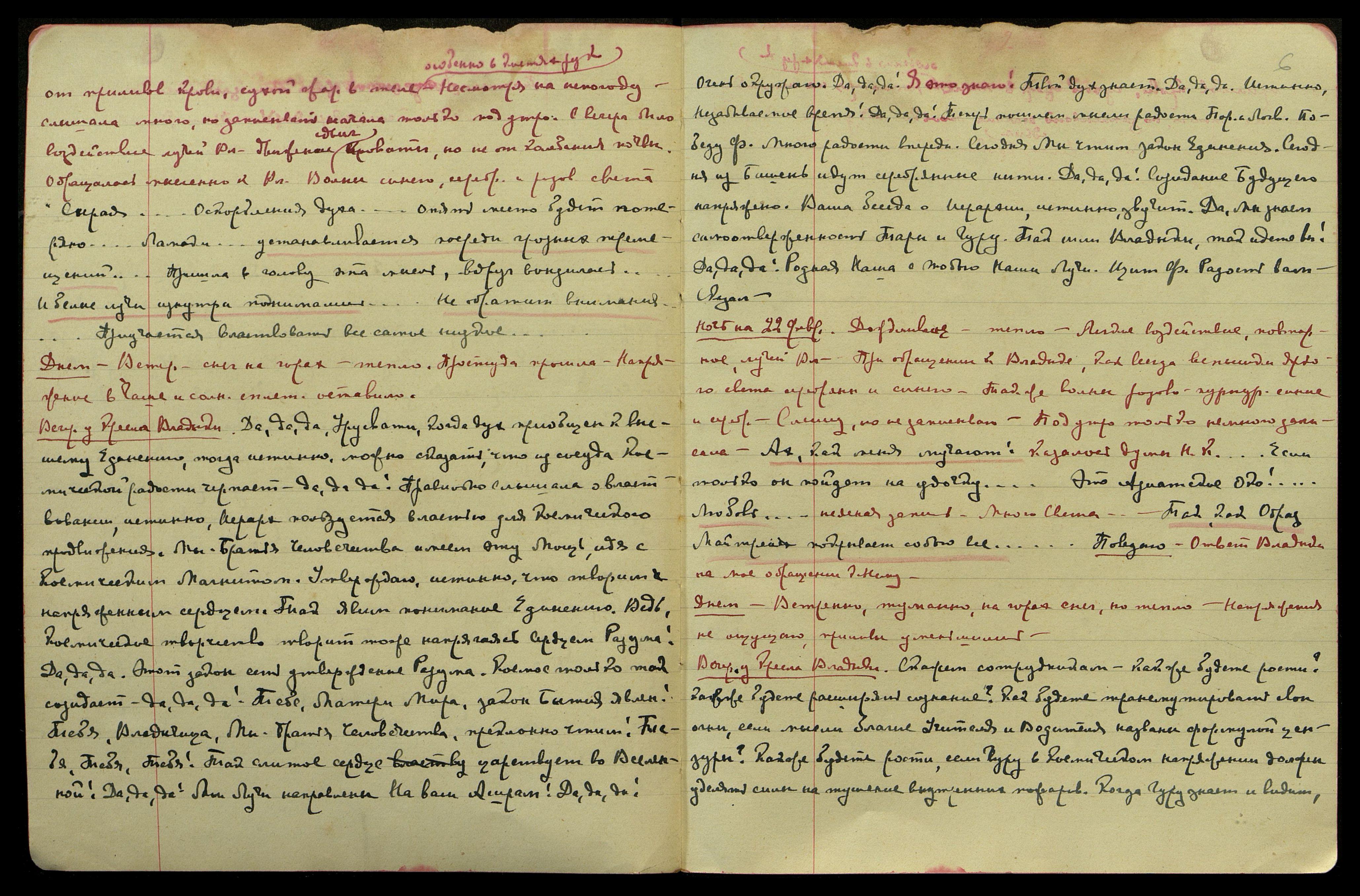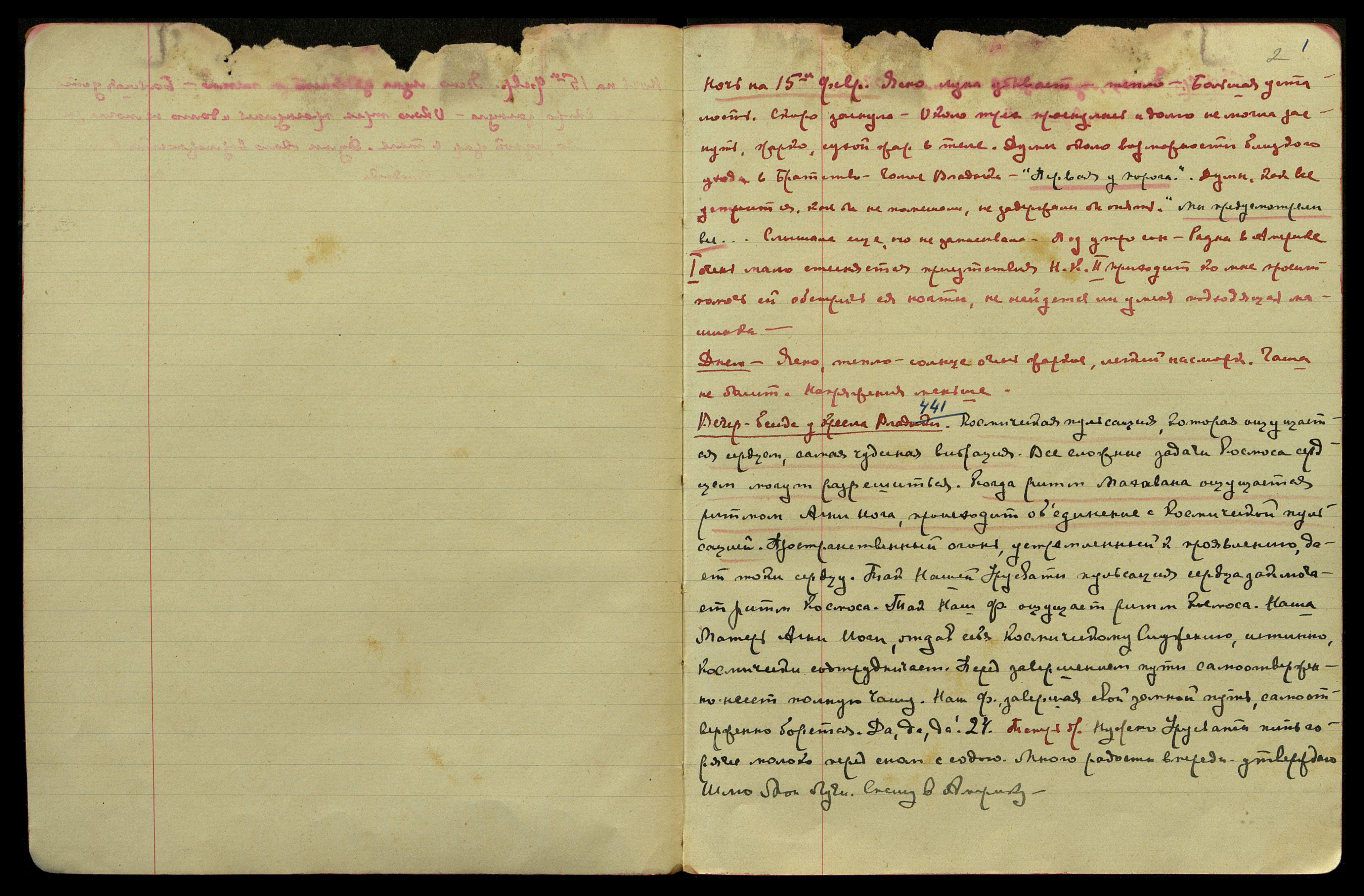 Ночь на 20-ое февр[аля]. Тучно, но тепло. Воздействие лучей Владыки, вибрации постели, тот же ритм Махавана, но ударение на первой восьмой. Много мыслей, обращённых к Владыке. Много волн, синего, серебр[яного] и розов[ого] света, вспышки пламени. Слышу мало. Посреди ночи поднялся сильный ветер. Под утро голос Владыки:
