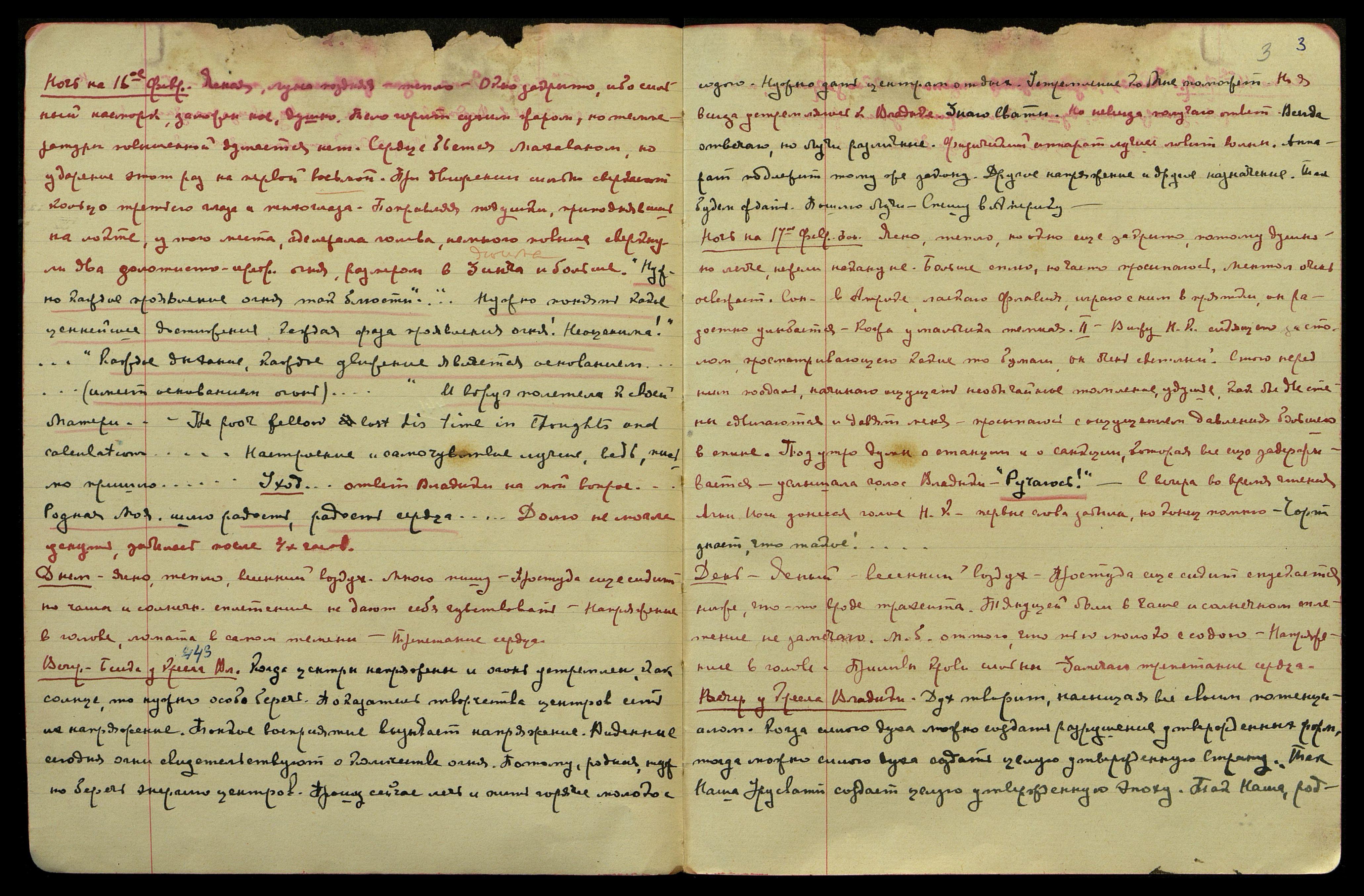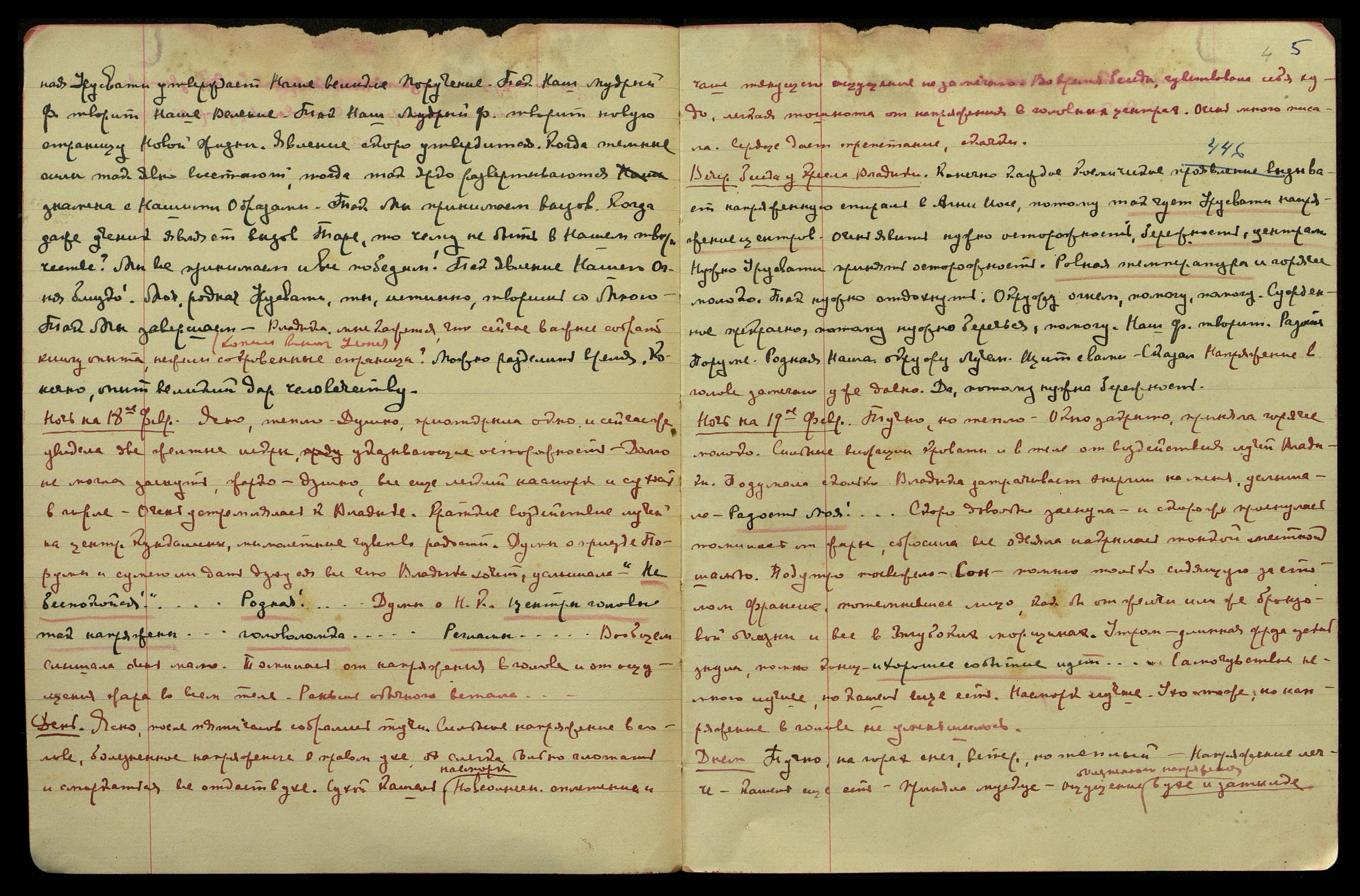Ночь на 17-ое февраля. Ясно, тепло, но окно ещё закрыто, потому душно, но легче, нежели накануне. Больше сплю, но часто просыпаюсь. Ментол очень освежает. Сон − [I.] в Америке, ласкаю Флавия, играю с ним в прятки, он радостно улыбается. Кожа у мальчика тёмная. II. Вижу Н.К. сидящего за столом, просматривающего какие-то бумаги. Он очень светлый. Стою перед ним поодаль, начинаю ощущать необычайное томление, удушье, как бы две стены сдвигаются и давят на меня − просыпаюсь с ощущением давления большого в спине. Под утро думы о станции и о санкции, которая всё ещё задерживается − услышала голос Владыки: "Ручаюсь!". С вечера во время чтения Агни Йоги донёсся голос Н.К., первые слова забыла, но конец помню: "Чёрт знает, что такое!..."