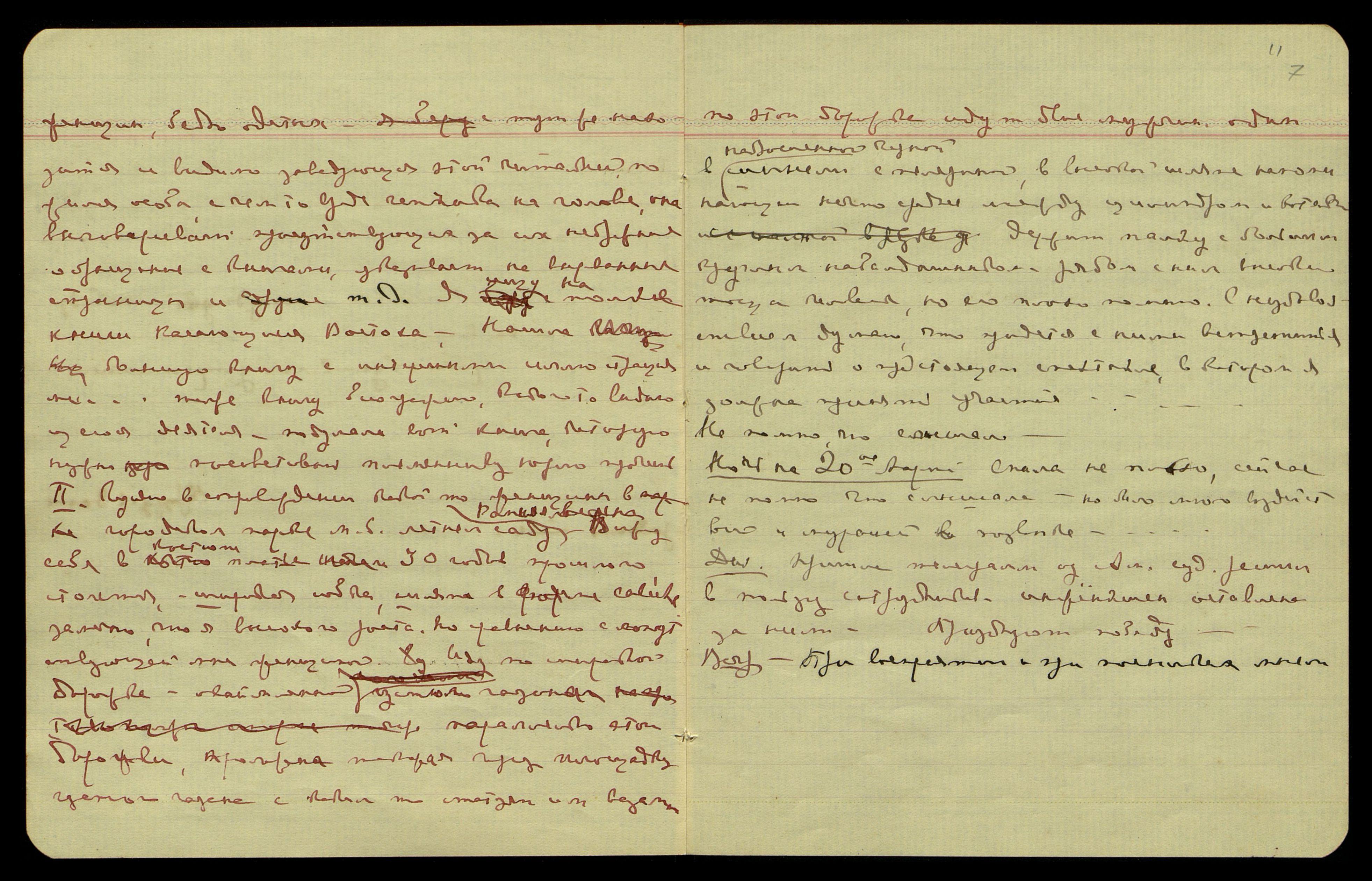 Ночь на 3-ье марта. Видение незнакомых людей, заседание, по-видимому, русских, доносятся голоса и отрывочные слова, кот[орые] не записала тогда, а сейчас не помню. Но посреди ночи было необычное явление. Проснувшись, я приподнялась на кровати, чтобы заглянуть в окно, — и тут же, почти на уровне моих глаз, блеснул свет, и я увидела как бы молнию, вернее, широкий луч золотисто-лилового тона на пространстве футов* в пять. Это огненное явление было в самой комнате, а не за окном, причём в скорости своей оно не было молниеносно, но продержалось секунды две-три. Но сразу я подумала о молнии и стала ожидать грома, но он не последовал, подумала о зарнице и стала ждать повторения этого явления, но ничего больше не последовало. Затем уже вспомнила, что при этом явлении я не заметила того освещения всей комнаты, которое всегда сопровождает молнию. Кроме того, явление это уже очень близко было от меня.