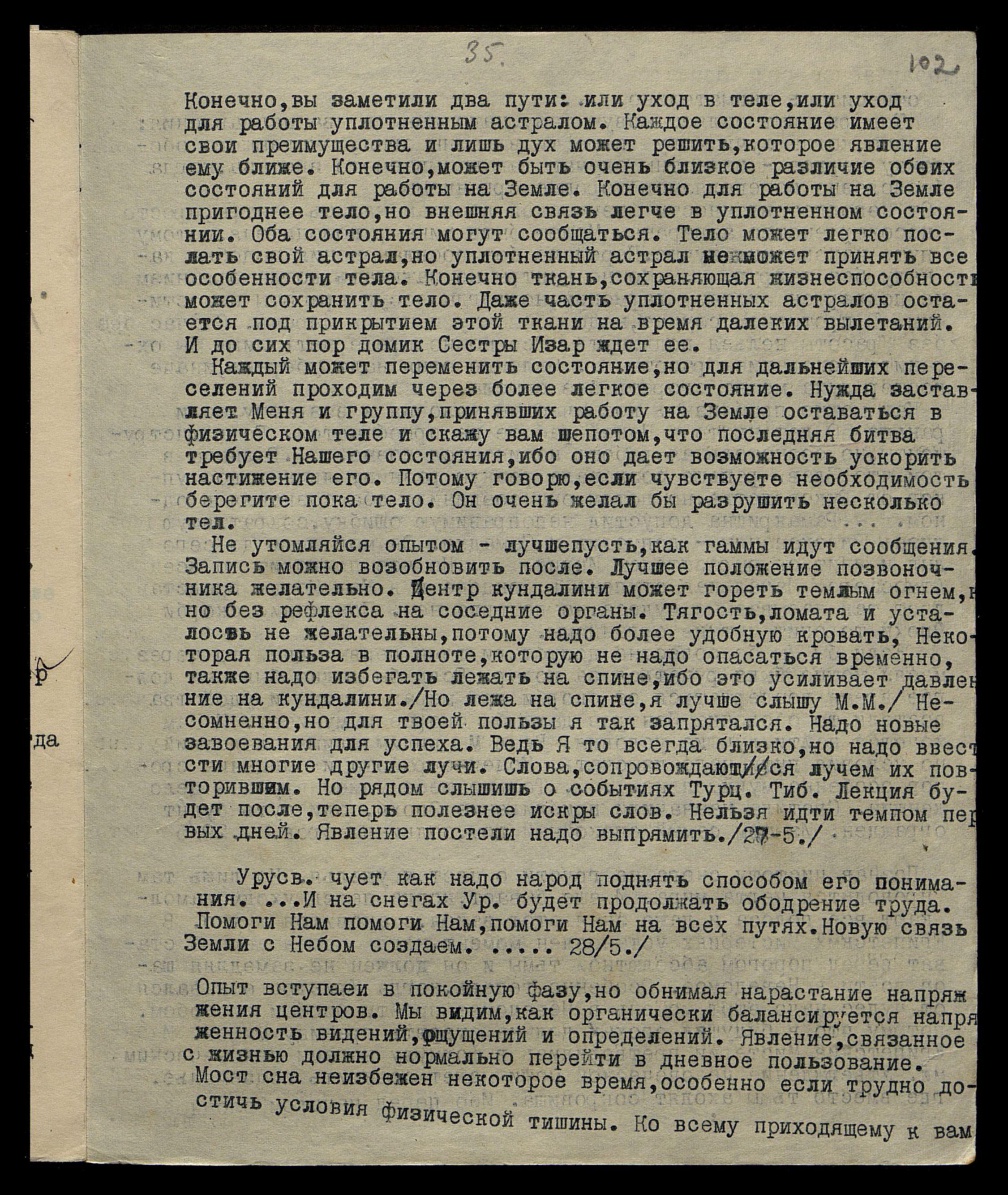 Конечно, вы заметили два пути: или уход в теле, или уход для работы уплотненным астралом. Каждое состояние имеет свои преимущества и лишь дух может решить, которое явление ему ближе. Конечно, может быть очень близкое различие обоих состояний для работы на Земле. Конечно, для работы на Земле пригоднее тело, но внешняя связь легче в уплотнённом состоянии. Оба состояния могут сообщаться. Тело может легко послать свой астрал, но уплотнённый астрал не может принять все особенности тела. Конечно, ткань, сохраняющая жизнеспособность, может сохранить тело. Даже часть уплотнённых астралов остаётся под прикрытием этой ткани на время далеких вылетаний. И до сих пор домик Сестры Изар ждёт её.