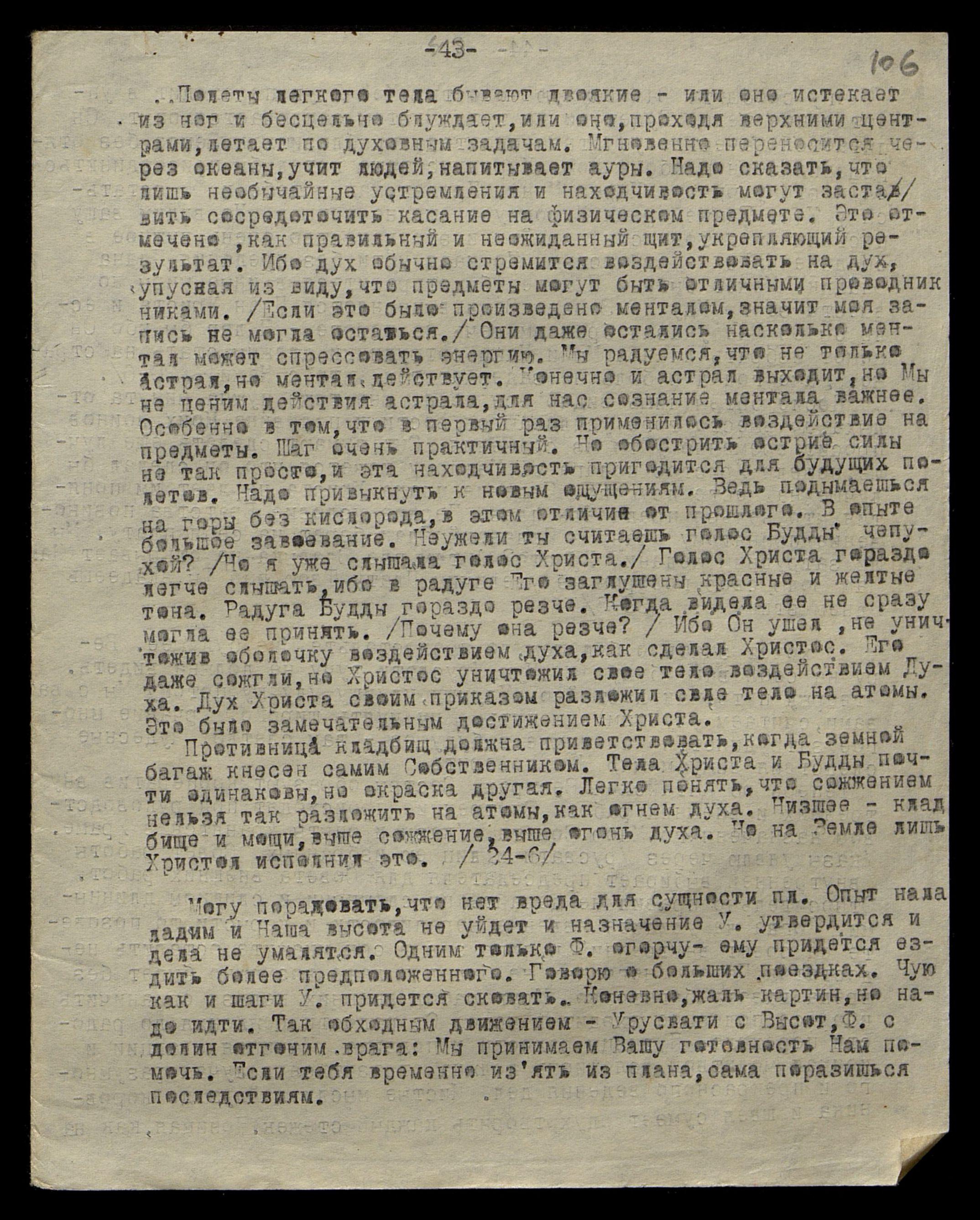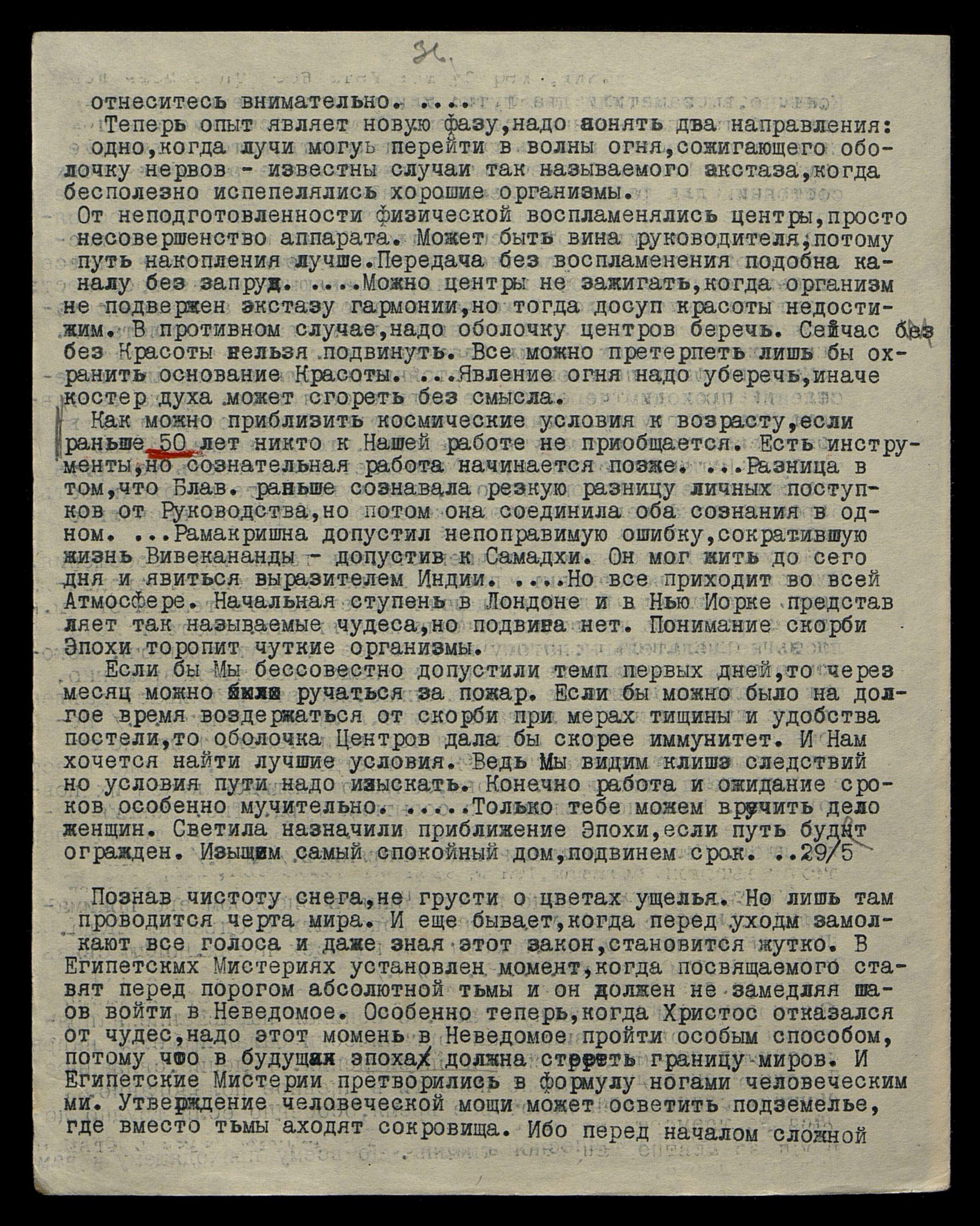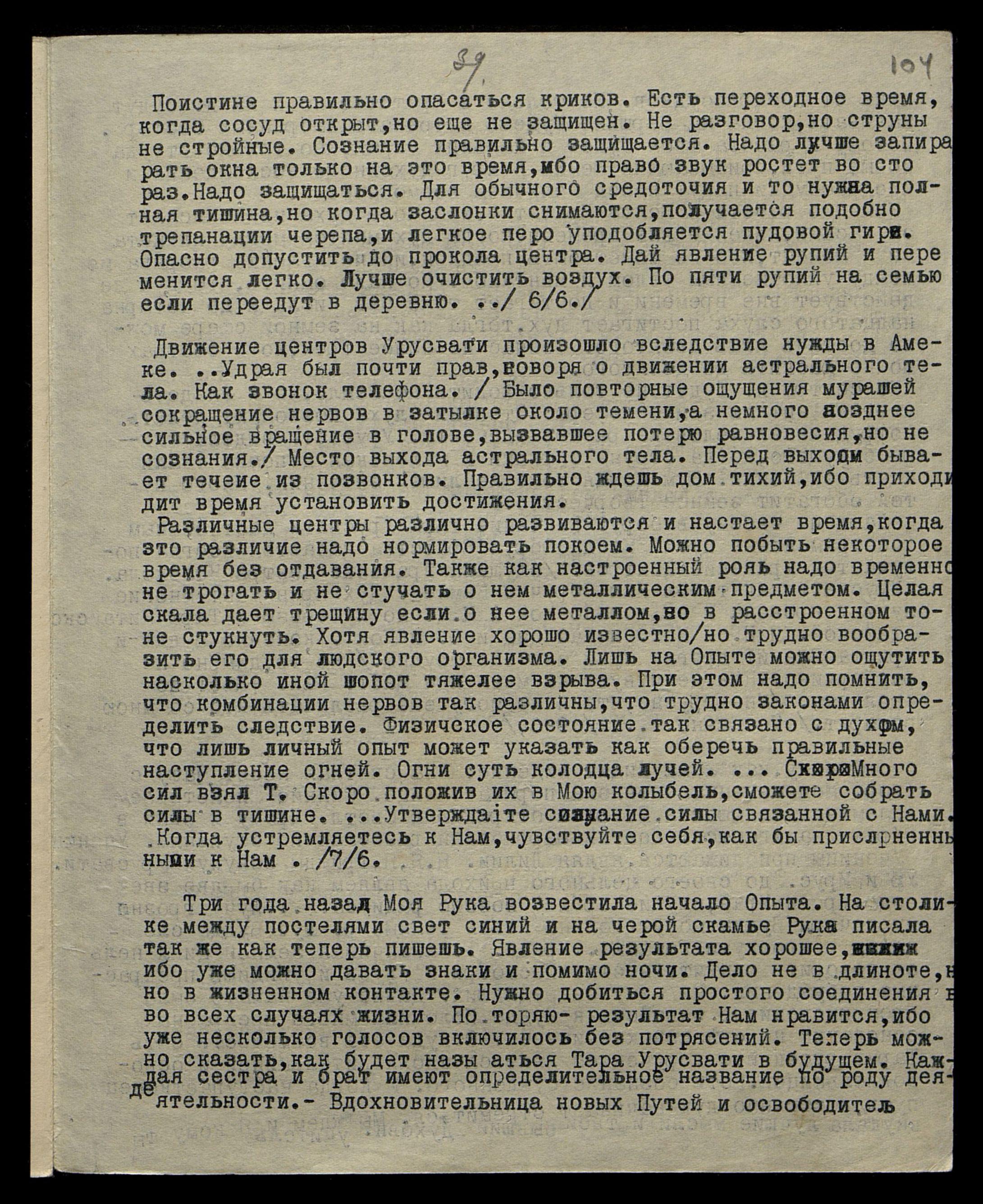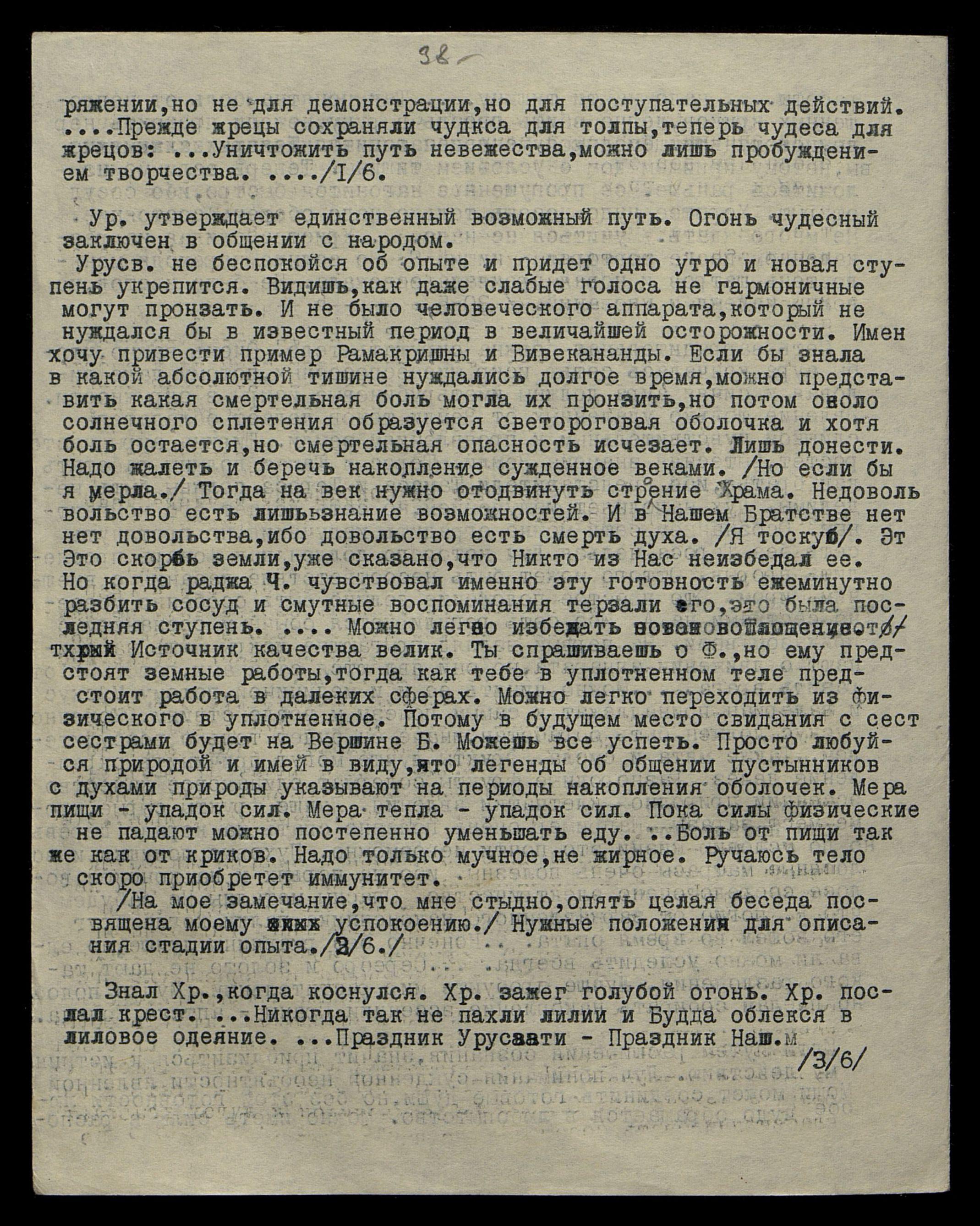 30/6. Могу порадовать, что нет вреда для сущности пл[оти]. Опыт наладим, и Наша высота не уйдет, и назначение У[драи] утвердится, и дела не умалятся. Одним только Ф[уяму] огорчу — ему придётся ездить более предположенного. Говорю о больших поездках. Чую, как и шаги У[драи] придётся сковать. Конечно, жаль картины, но надо идти. Так обходным движением: Урусвати с высот, Ф[уяма] с долин — отгоним врага. Мы принимаем вашу готовность Нам помочь. Если тебя временно изъять из плана, сама поразишься последствиям.