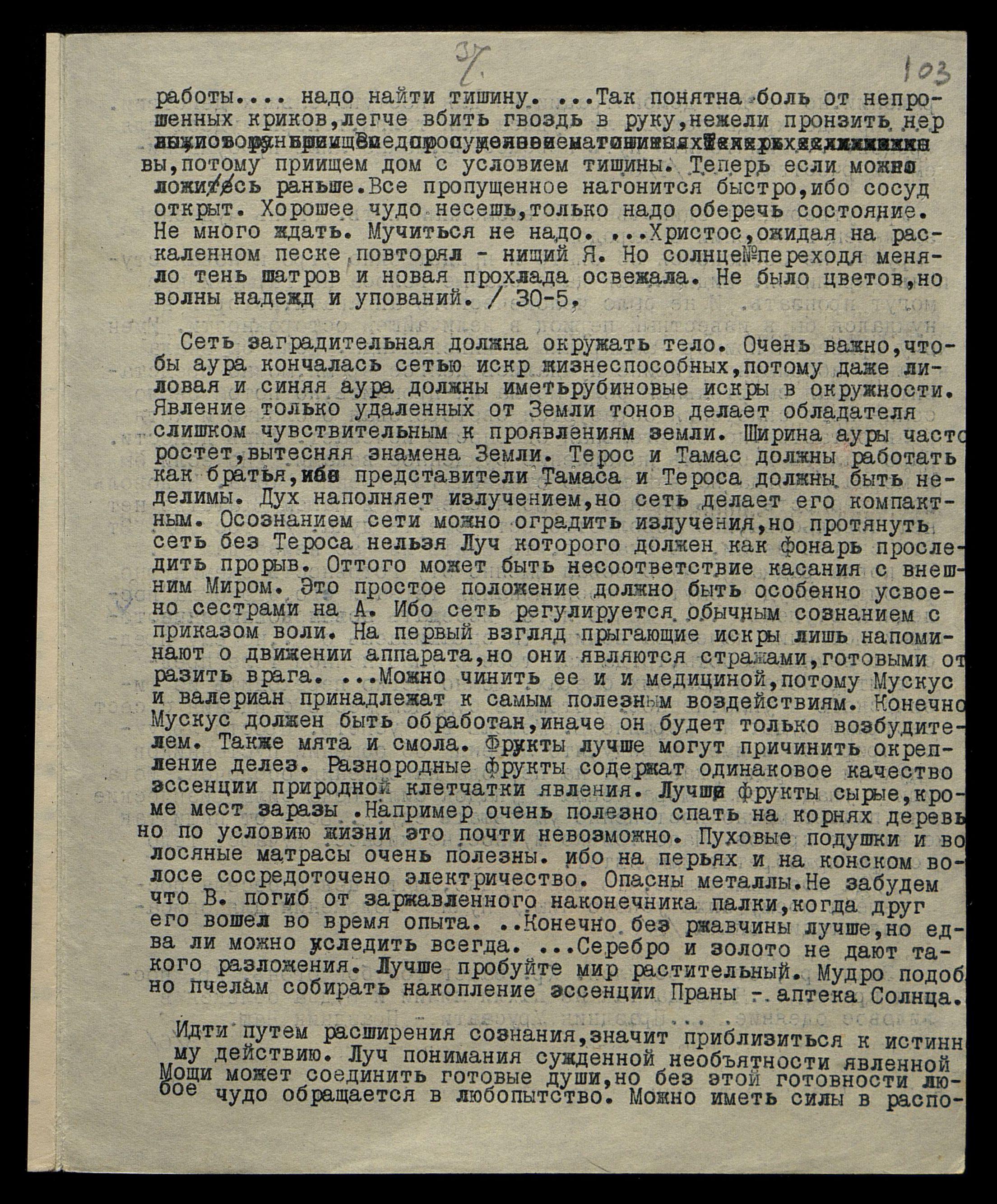 31/5. Сеть заградительная должна окружать тело. Очень важно, чтобы аура кончалась сетью искр жизнеспособных, потому даже лиловая и синяя аура должны иметь рубиновые искры в окружности. Явление только удалённых от Земли тонов делает обладателя слишком чувствительным к проявлениям земли. Ширина ауры часто растёт, вытесняя знамёна Земли. Терос и Тамас должны работать как братья, ибо представители Тамаса и Тероса должны быть неделимы. Дух наполняет излучением, но сеть делает его компактным. Осознанием сети можно оградить излучения, но протянуть сеть без Тероса нельзя, Луч которого должен, как фонарь, проследить прорыв. Оттого может быть несоответствие касания с внешним Миром. Это простое положение должно быть особенно усвоено сёстрами на А[лтае]. Ибо сеть регулируется обычным сознанием с приказом воли. На первый взгляд прыгающие искры лишь напоминают о движении аппарата, но они являются стражами, готовыми отразить врага... Можно чинить её и медициной, потому мускус и валериан принадлежат к самым полезным воздействиям. Конечно, мускус должен быть обработан, иначе он будет только возбудителем. Так же мята и смола. Фрукты лучше могут причинить окрепление желёз. Разнородные фрукты содержат одинаковое качество эссенции природной клетчатки явления. Лучше фрукты сырые, кроме мест заразы. Например, очень полезно спать на корнях деревьев, но по условию жизни — это почти невозможно. Пуховые подушки и волосяные матрасы очень полезны, ибо на перьях и на конском волосе сосредоточено электричество. Опасны металлы. Не забудем, что В[оган] погиб от заржавленного наконечника палки, когда друг его вошёл во время опыта... Конечно, без ржавчины лучше, но едва ли можно уследить всегда... Серебро и золото не дают такого разложения. Лучше пробуйте мир растительный. Мудро, подобно пчёлам, собирать накопление эссенции Праны — аптека Солнца.