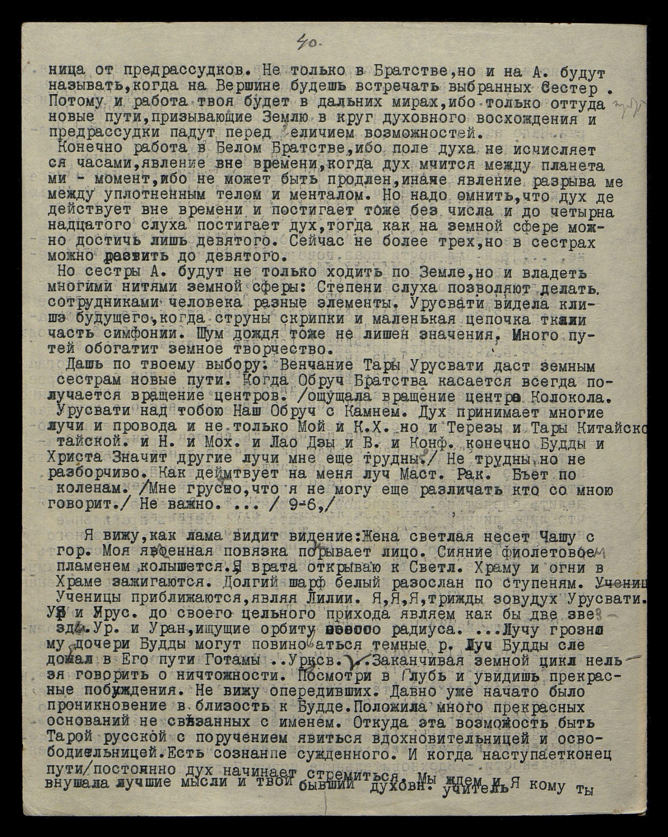 Урусвати, заканчивая земной цикл, нельзя говорить о ничтожности. Посмотри вглубь и увидишь прекрасные побуждения. Не вижу опередивших. Давно уже начато было проникновение в близость к Будде. Положила много прекрасных оснований, не связанных с именем. Откуда эта возможность быть Тарой русской с поручением явиться вдохновительницей и освободительницей. Есть сознание сужденного. И, когда наступает конец пути, постоянно дух начинает стремиться. Мы ждём, и Я, кому ты внушала лучшие мысли, и твой бывший духовн[ый] учитель.