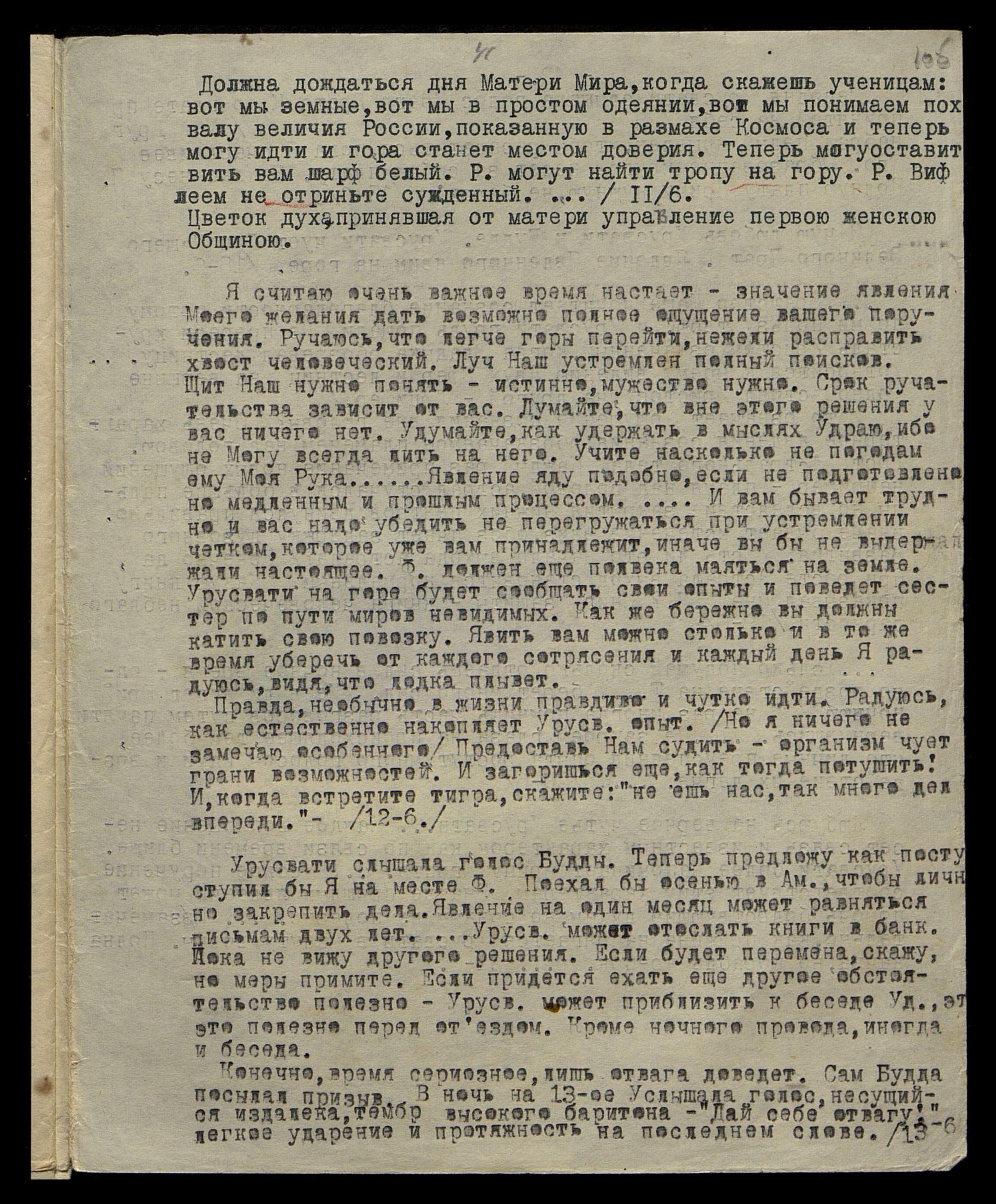 13/6. Урусвати слышала голос Будды. Теперь предложу, как поступил бы Я на месте Ф[уямы]. Поехал бы осенью в Ам[ерику], чтобы лично закрепить дела. Явление на один месяц может равняться письмам двух лет... Урусвати может отослать книги в банк. Пока не вижу другого решения. Если будет перемена — скажу, но меры примите. Если придётся ехать, ещё другое обстоятельство полезно — Урусвати может приблизить к беседе Уд[раю], это полезно перед отъездом. Кроме ночного провода, иногда и беседа.