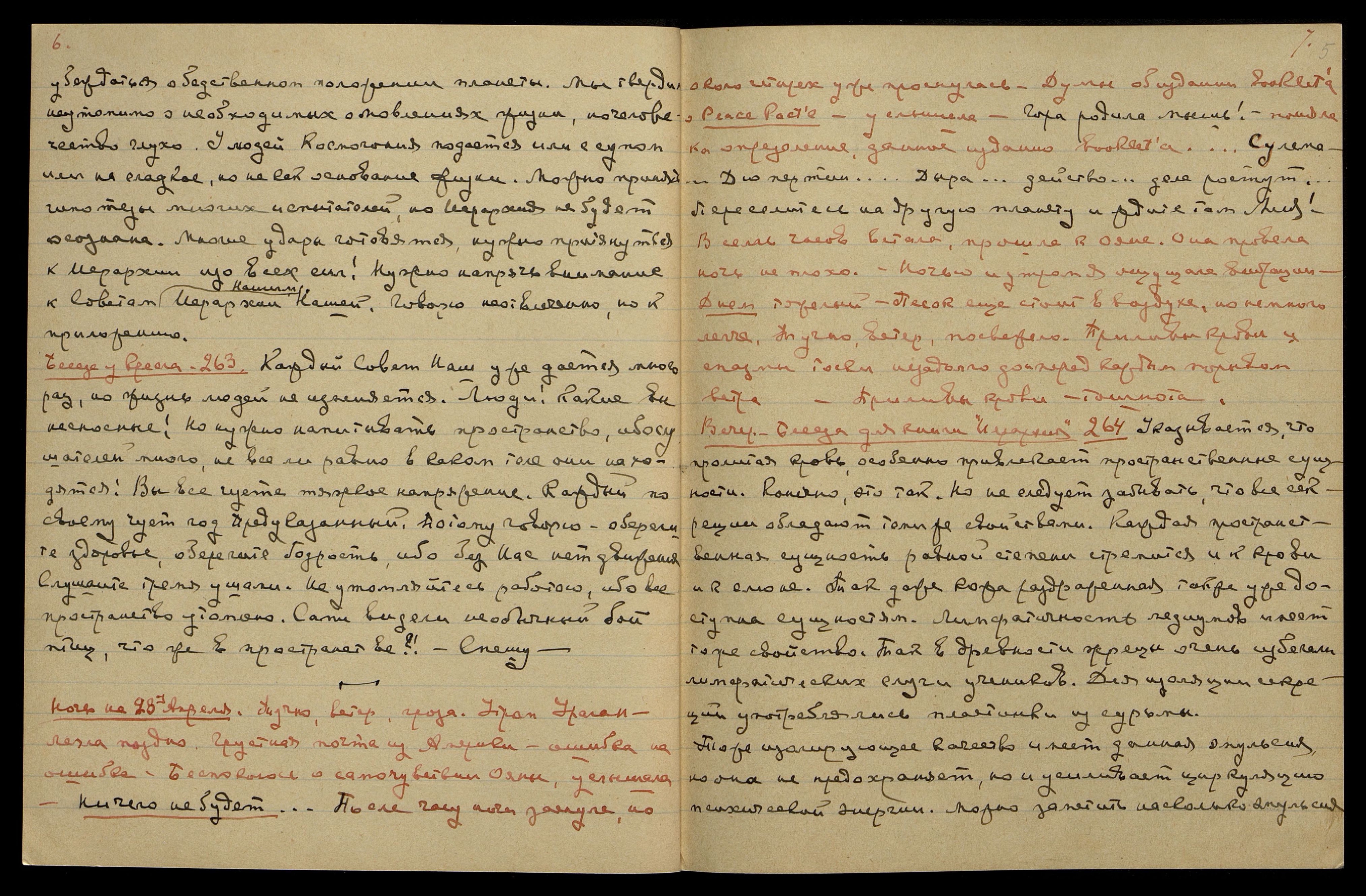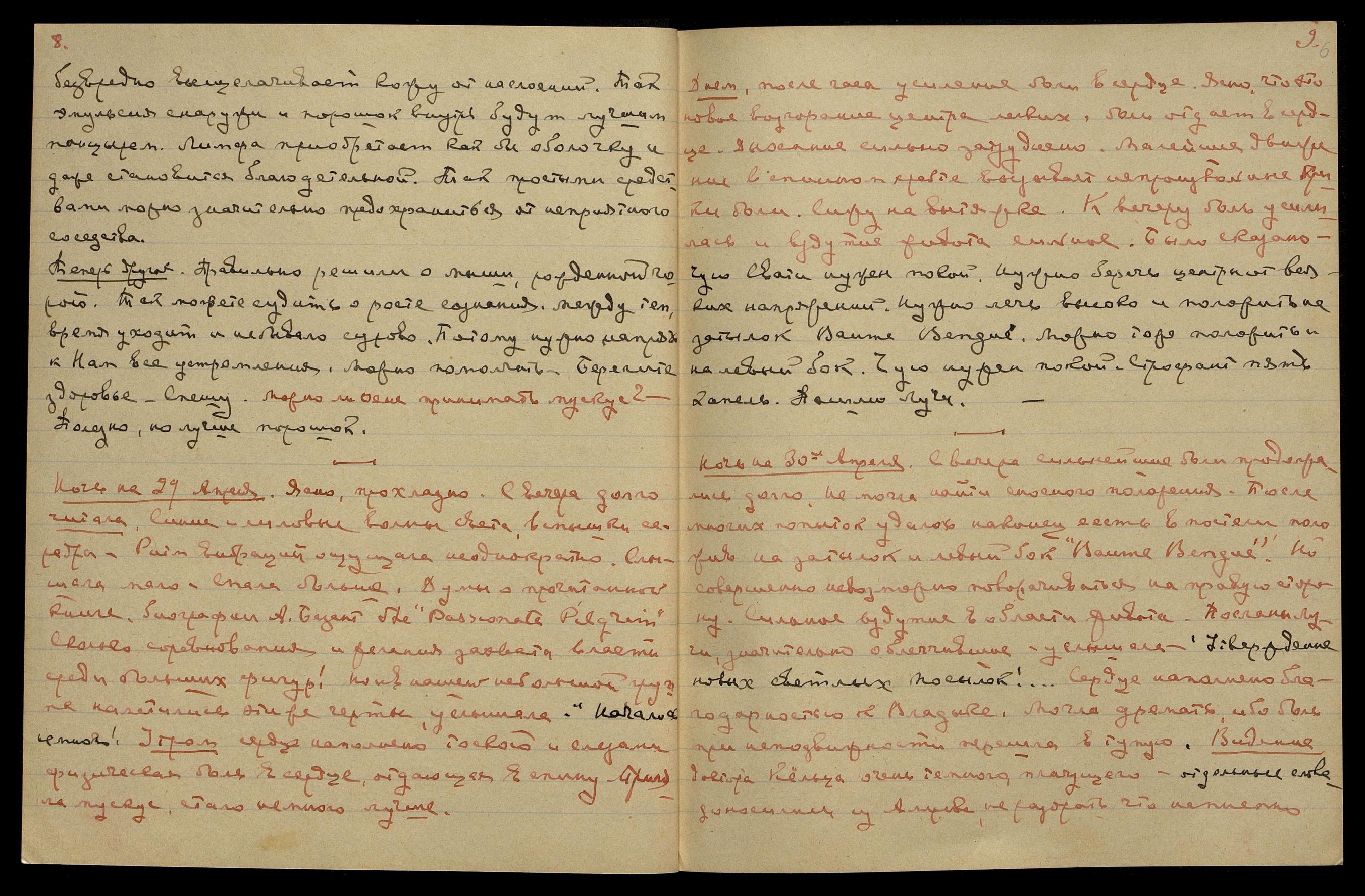 Ночь на 29-ое апреля. Ясно, прохладно. С вечера долго читала. Синие и лиловые волны света, вспышки серебра. Ритм вибраций ощущала неоднократно. Слышала мало, спала больше. Думы о прочитанной книге-биографии А. Безант The "Passionate Pilgrim" [англ.: "Страстный Путник"]. Сколько соревнования и желания захвата власти среди больших фигур! Но и в нашей небольшой группе наметились эти же черты, услышала: "Начались немного".