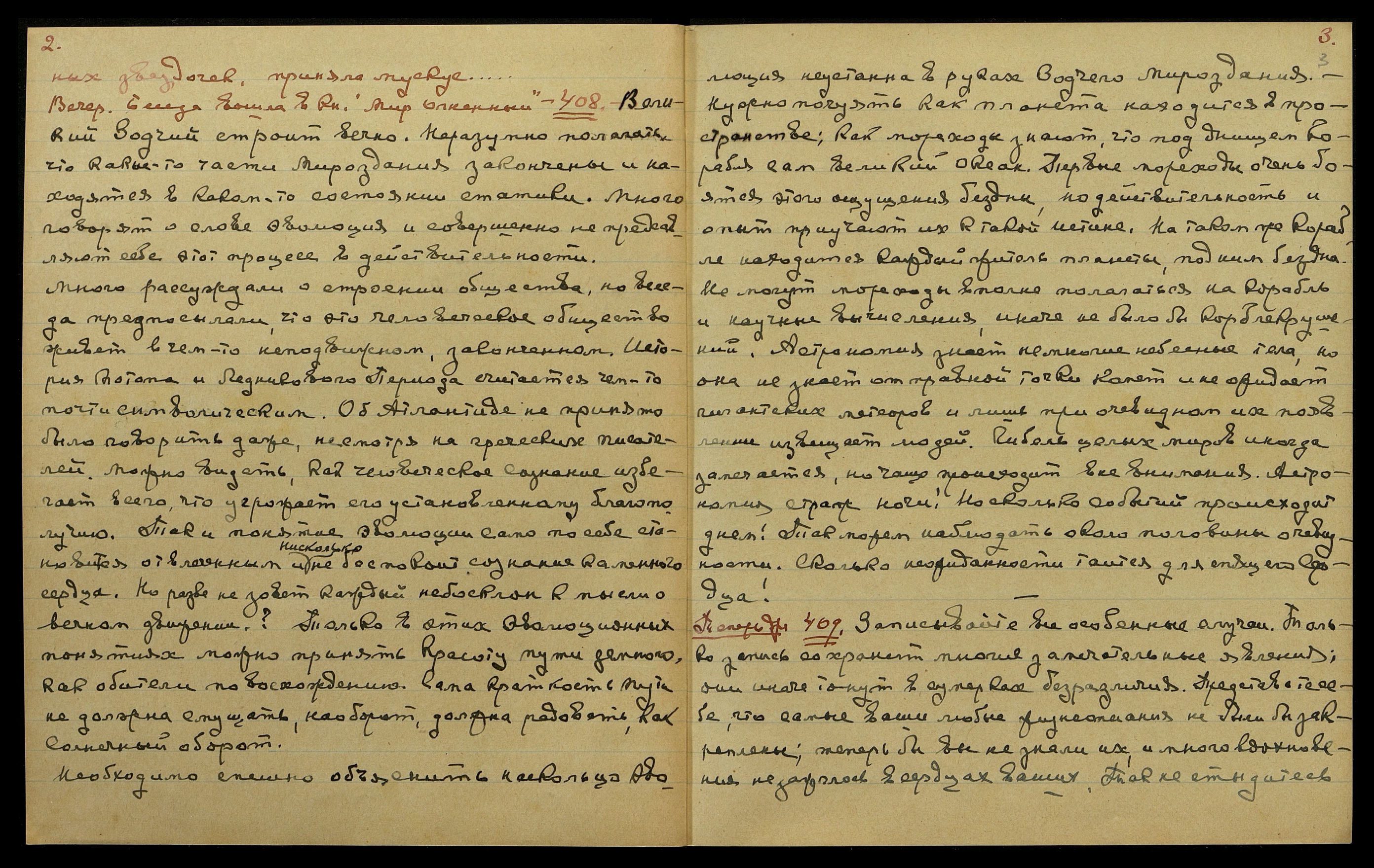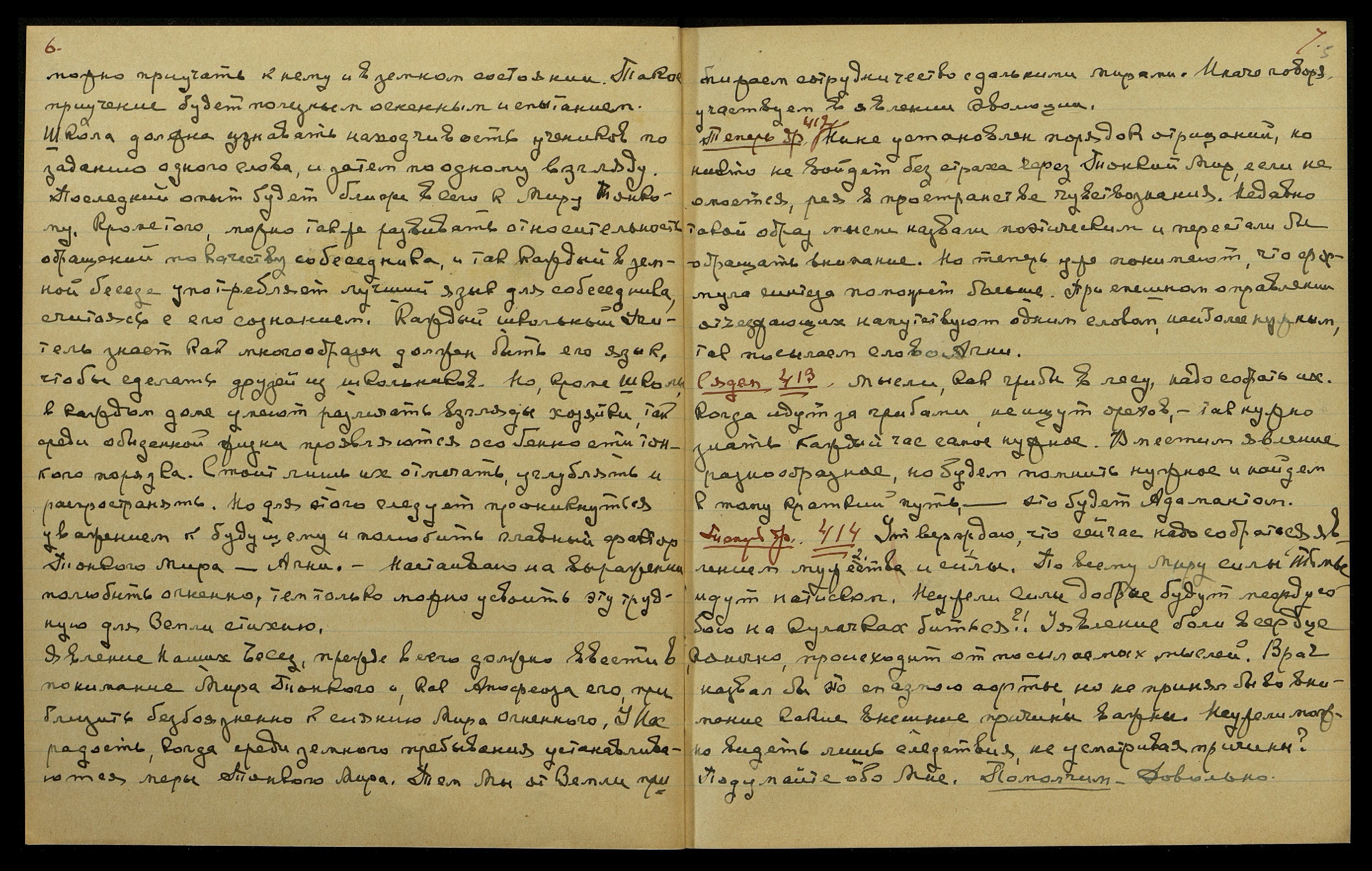 Теперь др[угое] 409. Записывайте все особенные случаи. Только запись сохранит многие замечательные явления; они иначе тонут в сумерках безразличия. Представьте себе, что самые ваши любые жизнеописания не были бы закреплены; теперь бы вы не знали их, и много вдохновения не зажглось в сердцах ваших. Так не стыдитесь