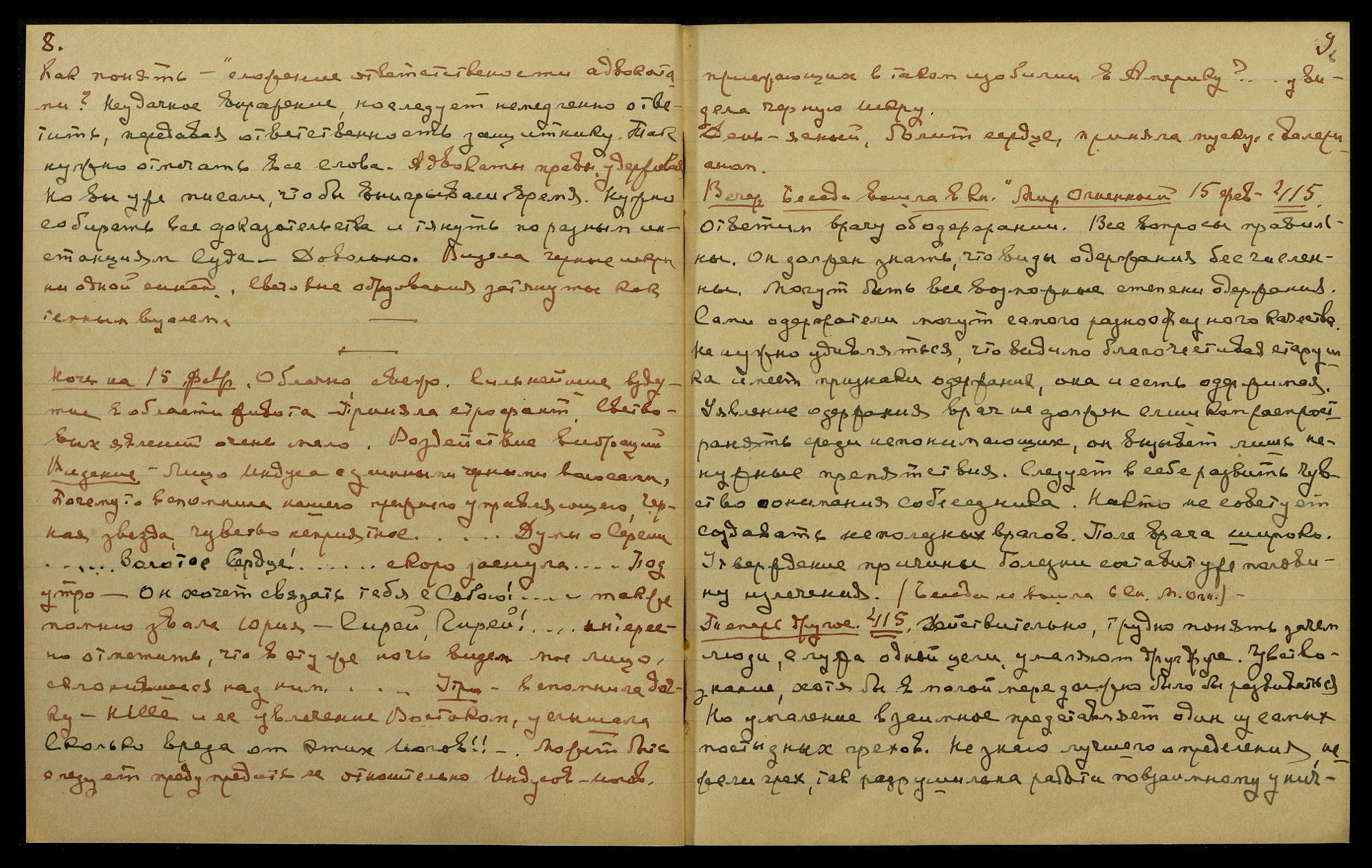 Ночь на 15 февр[аля]. Облачно, свежо. Сильнейшее вздутие в области живота. Приняла строфант. Световых явлений очень мало. Воздействие вибраций. Видение: лицо Индуса с длинными чёрными волосами. Почему-то вспомнила нашего прежнего управляющего, чёрная звезда, чувство неприятное... Думы о Сергии, — "Золотое Сердце!"... Скоро заснула... Под утро, — "Он хочет связать тебя с Собою!"... Также помню, звала Юрия, — "Гирей, Гирей!"... Интересно отметить, что в эту же ночь видела моё лицо, склонившееся над ним...
