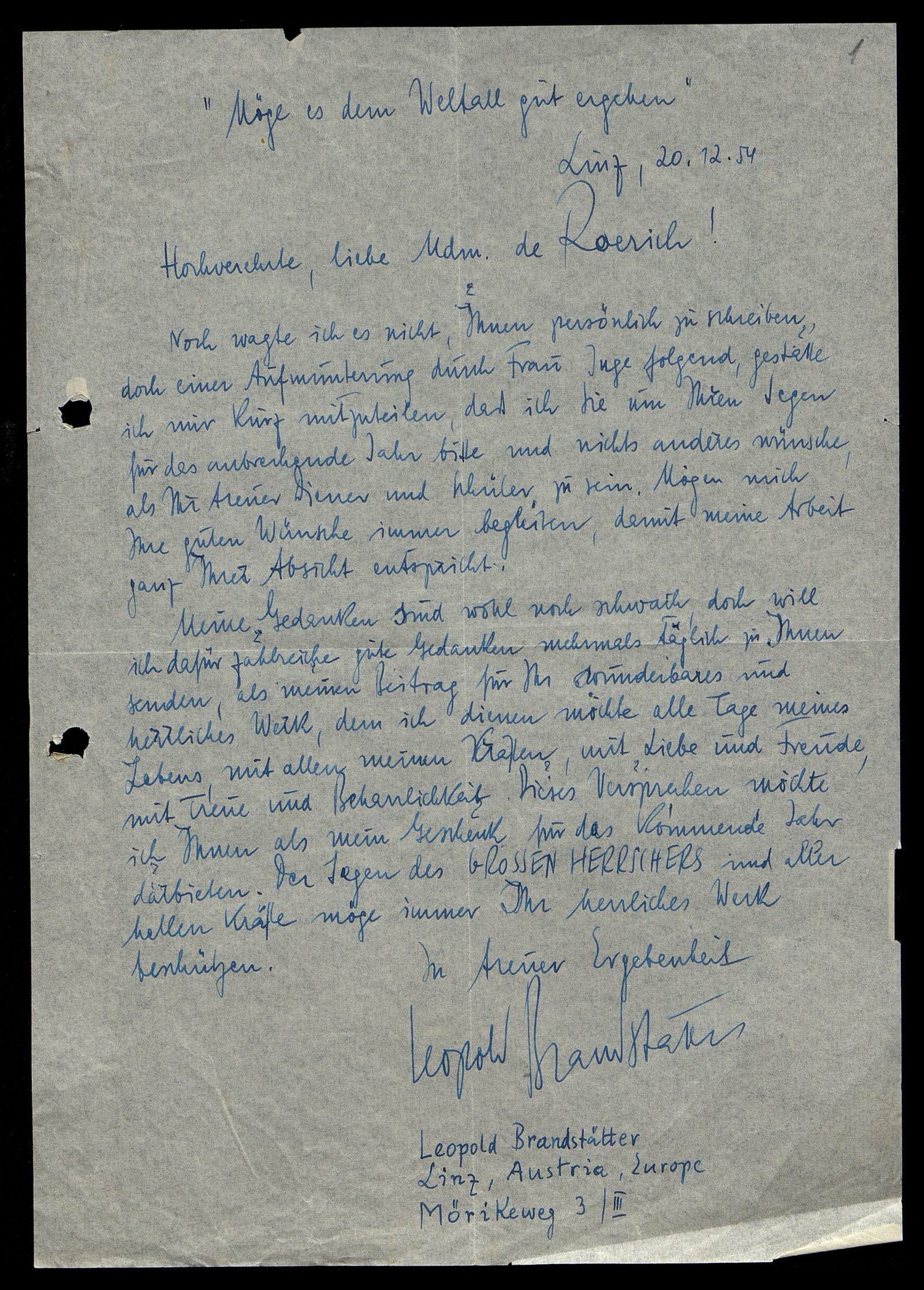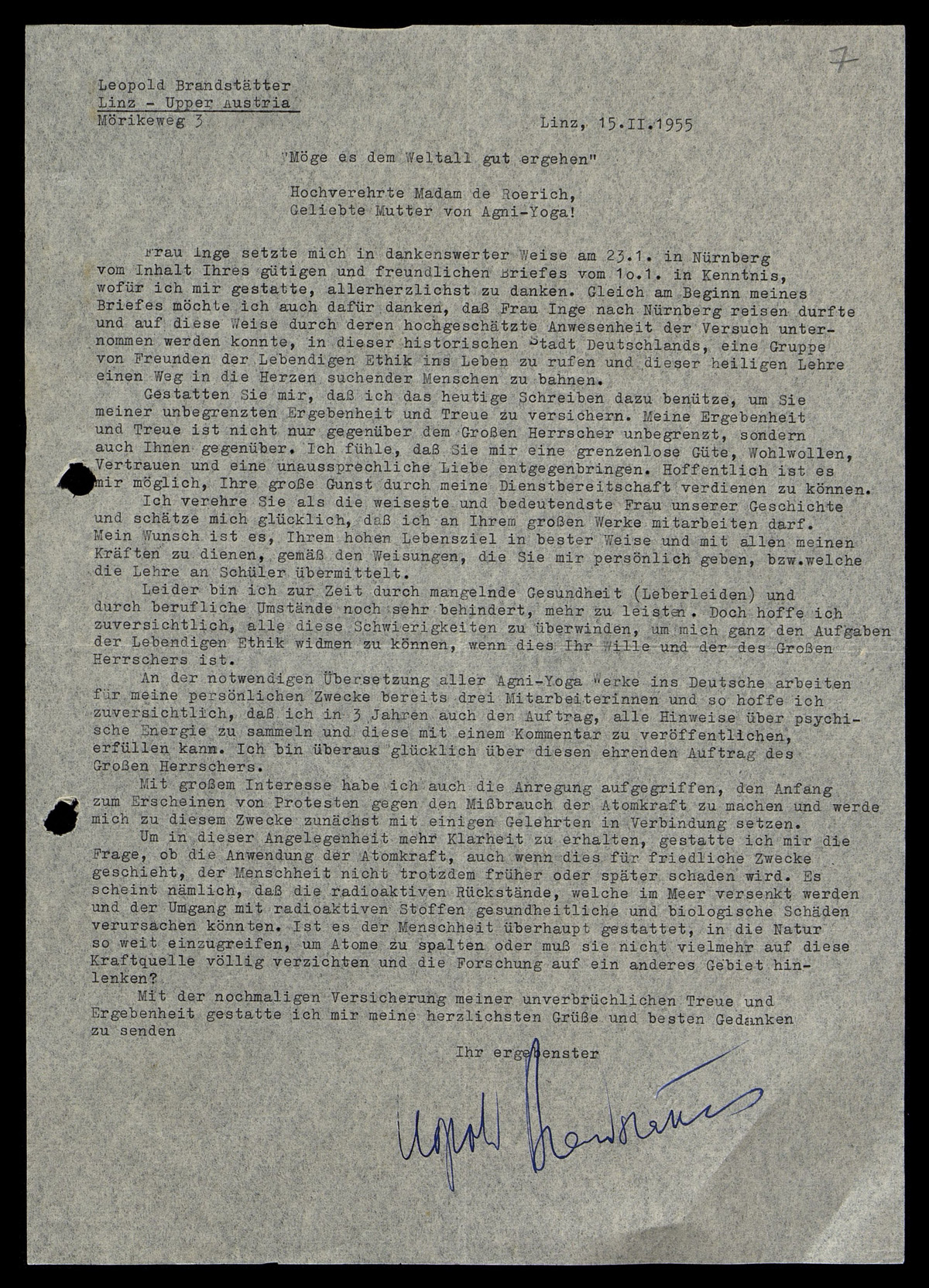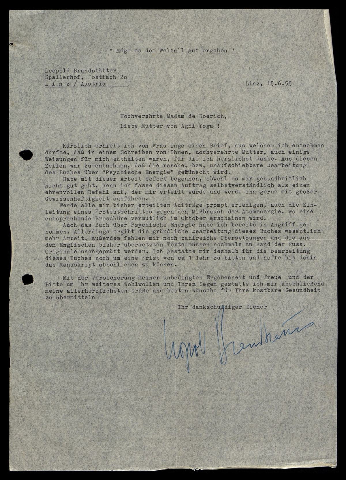 Название, датировка и формат оригинала на сайте ГМР: Письма к Е.И.Рерих Брандштеттер Леопольд (Bradstaetter Leopold), (австрийский эзотерик, один из основателей общества «Мировая спираль») 1954.12.20 - 1955.11.15 немецкий Австрия, Линц 5 писем