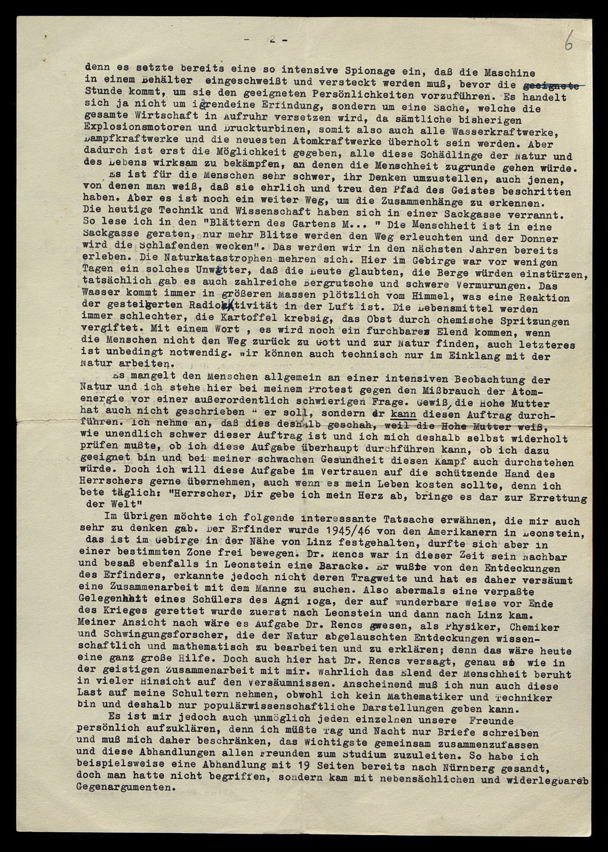 Werde meinen Urlaub dazu verwenden, um diese Sache im Zusammenhang mit dem Mißbrauch der Atomkraft in einer leicht faßlichen schriftlichen Abhandlung darzustellen, da der Erfinder selbst dazu nicht die notwendige Ader besitzt, sondern erst durch unsere Zusammenarbeit, die überdies auch er bereits gesucht hat, der Erfolgt zu kommen scheint. Ich hoffe, daß die geplante Broschüre in einigen Monaten in Druck gelangen kann. So würde durch den Hinweis auf die grandiosen Gefahren, die uns durch Atomexplosionen bedrohen, zugleich der Ausweg zur Rettung aufgezeigt werden, der allen Menschen verständlich erschiene, denn mit Drohungen und Warnungen allein dürfte der Menschheit nicht gedient sein, nur ein gangbarer Ausweg, der allen Menschen einen Nutzen bietet, würde die geplante Aktion gegen den Mißbrauch der Atomkraft zu einem bedeutenden Erfolg führen. Ich biete herzlichst um Ihre diesbezügliche Nachricht, ob diese Zusammenarbeit erwünscht ist, da ich nichts ohne Ihr Einverständnis, bzw. Bewilligung durch den Herrscher unternehmen möchte.
