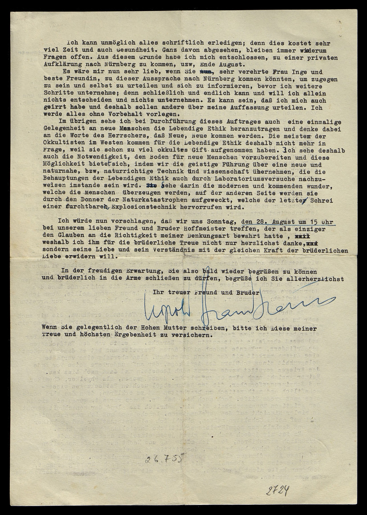 Ich würde nun vorschlagen, daß wir uns Sonntag, den 28. August um 15 Uhr bei unserem lieben Freund und Bruder Hoffmeister treffen, der als einziger den Glauben an die Richtigkeit meiner Denkungsart bewahrt hatte, weshalb ich ihm für die brüderliche Treue nicht nur herzlichst danke, sondern seine Liebe und sein Verständnis mit der gleichen Kraft der brüderlichen Liebe erwidern will.