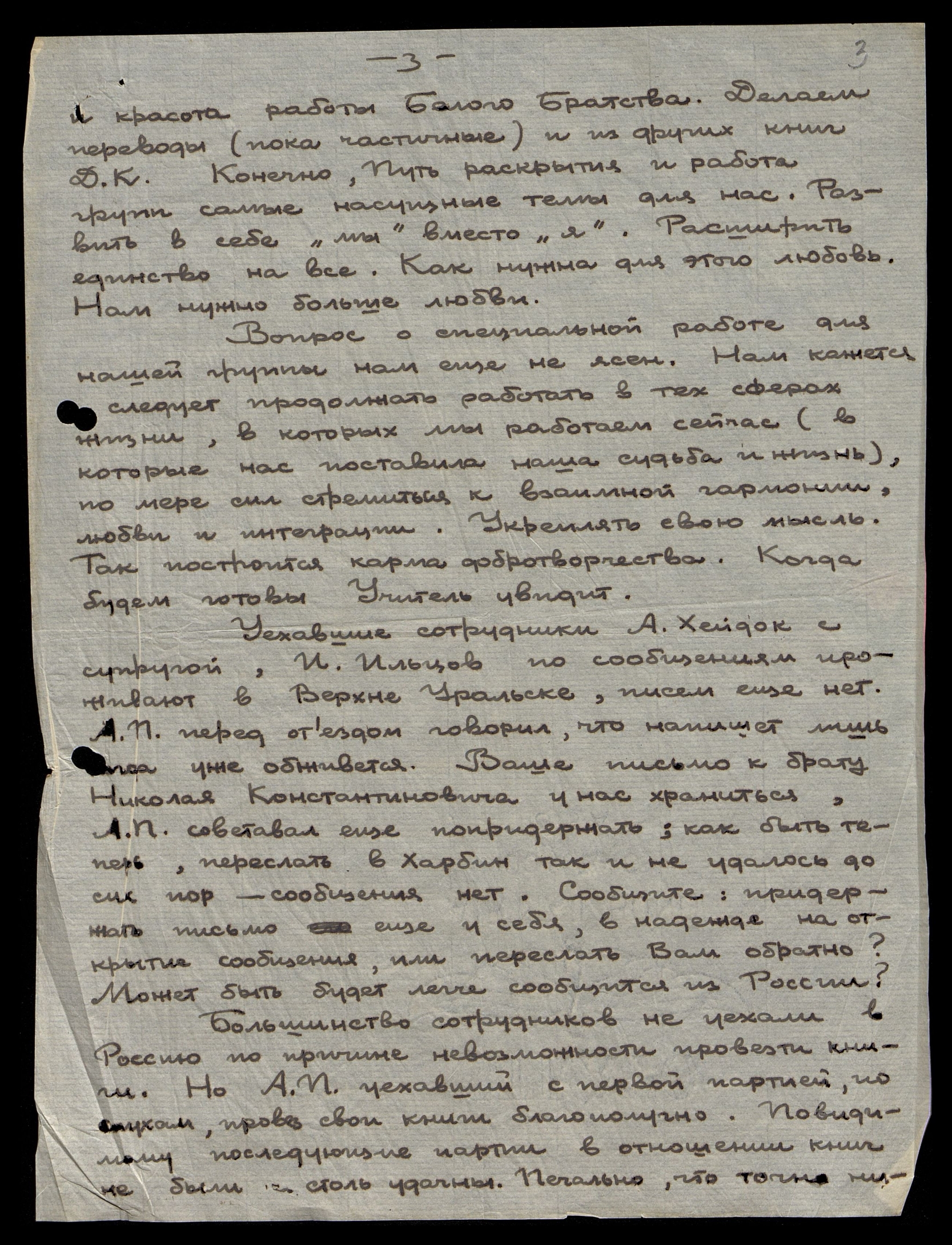 Уехавшие сотрудники − А. Хейдок с супругой, И. Ильцов, по сообщениям проживают в Верхне-Уральске, писем еще нет. А.П. [Хейдок] перед отъездом говорил, что напишет лишь когда уже обживется. Ваше письмо к брату Николая Константиновича у нас храниться. А.П. советовал еще попридержать; как быть теперь, переслать в Харбин так и не удалось до сих пор − сообщения нет. Сообщите: придержать письмо еще у себя в надежде на открытие сообщения или переслать Вам обратно? Может быть будет легче сообщится из России?
