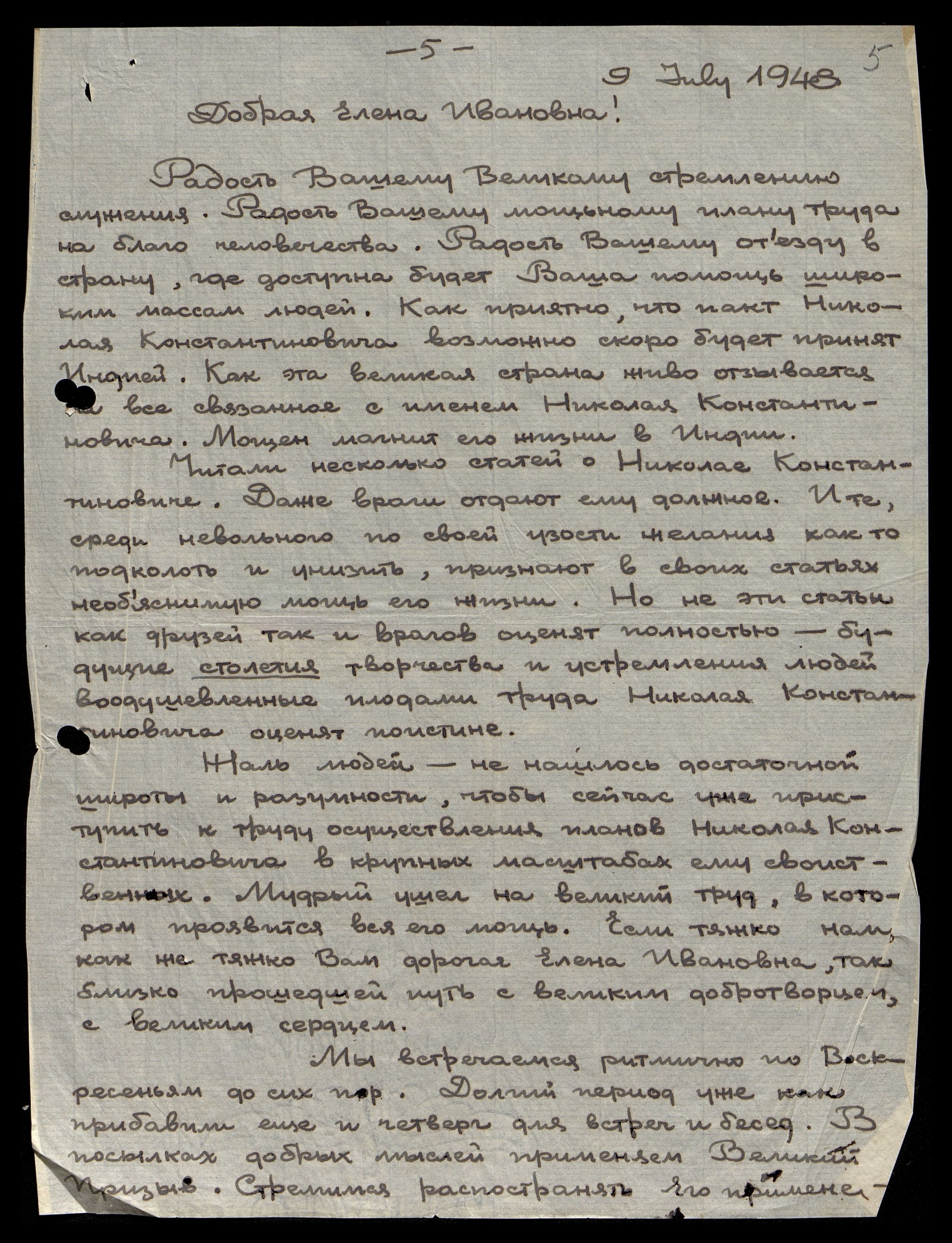 Радость Вашему Великому стремлению служения. Радость Вашему мощному плану труда на благо человечества. Радость Вашему отъезду в страну, где доступна будет Ваша помощь широким массам людей. Как приятно, что пакт Николая Константиновича возможно скоро будет принят Индией. Как эта великая страна живо отзывается на все связанное с именем Николая Константиновича. Мощен магнит его жизни в Индии.