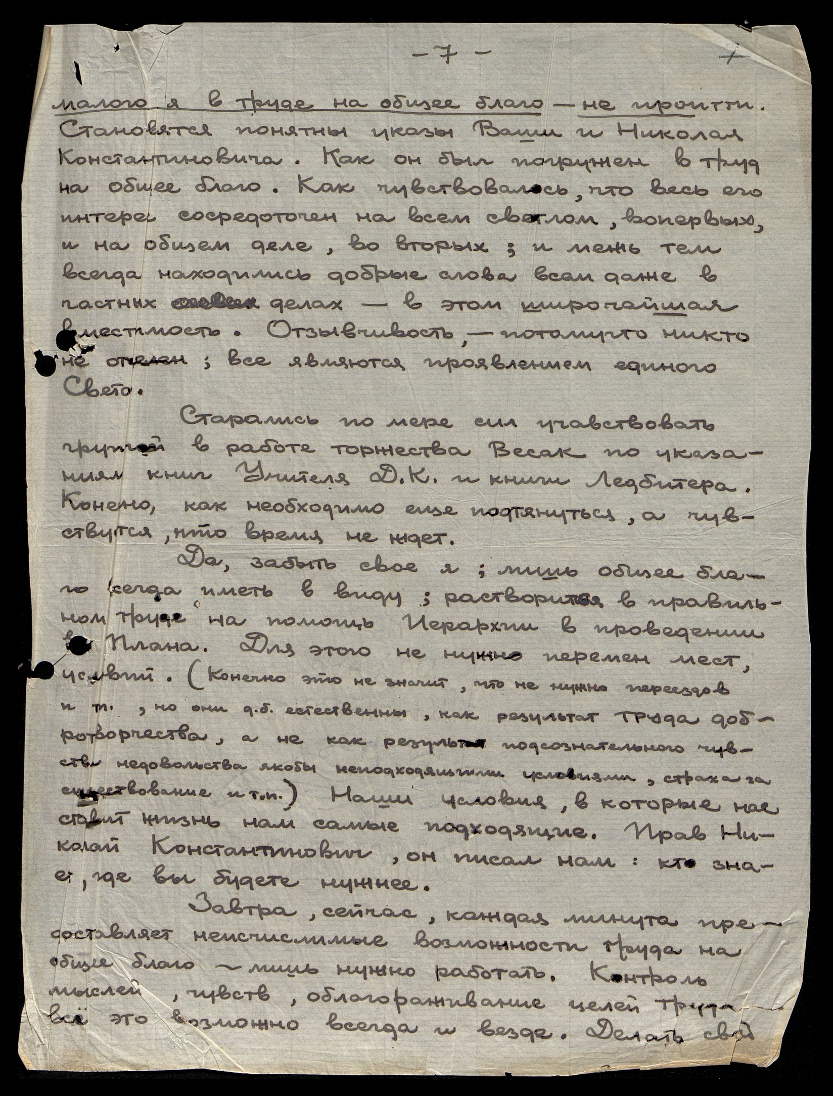Да, забыть свое я; лишь общее благо всегда иметь в виду; раствориться в правильном труде на помощь Иерархии в проведении [одно слово нечитаемо] Плана. Для этого не нужно перемен мест, условий. (Конечно это не значит, что не нужно переездов и т.п., но они д[олжны] б[ыть] естественны, как результат труда добротворчества, а не как результат подсознательного чувства недовольства якобы неподходящими условиями, страха за существование и т.п.) Наши условия, в которые нас ставит жизнь нам самые подходящие. Прав Николай Константинович, он писал нам: кто знает, где вы будете нужнее.