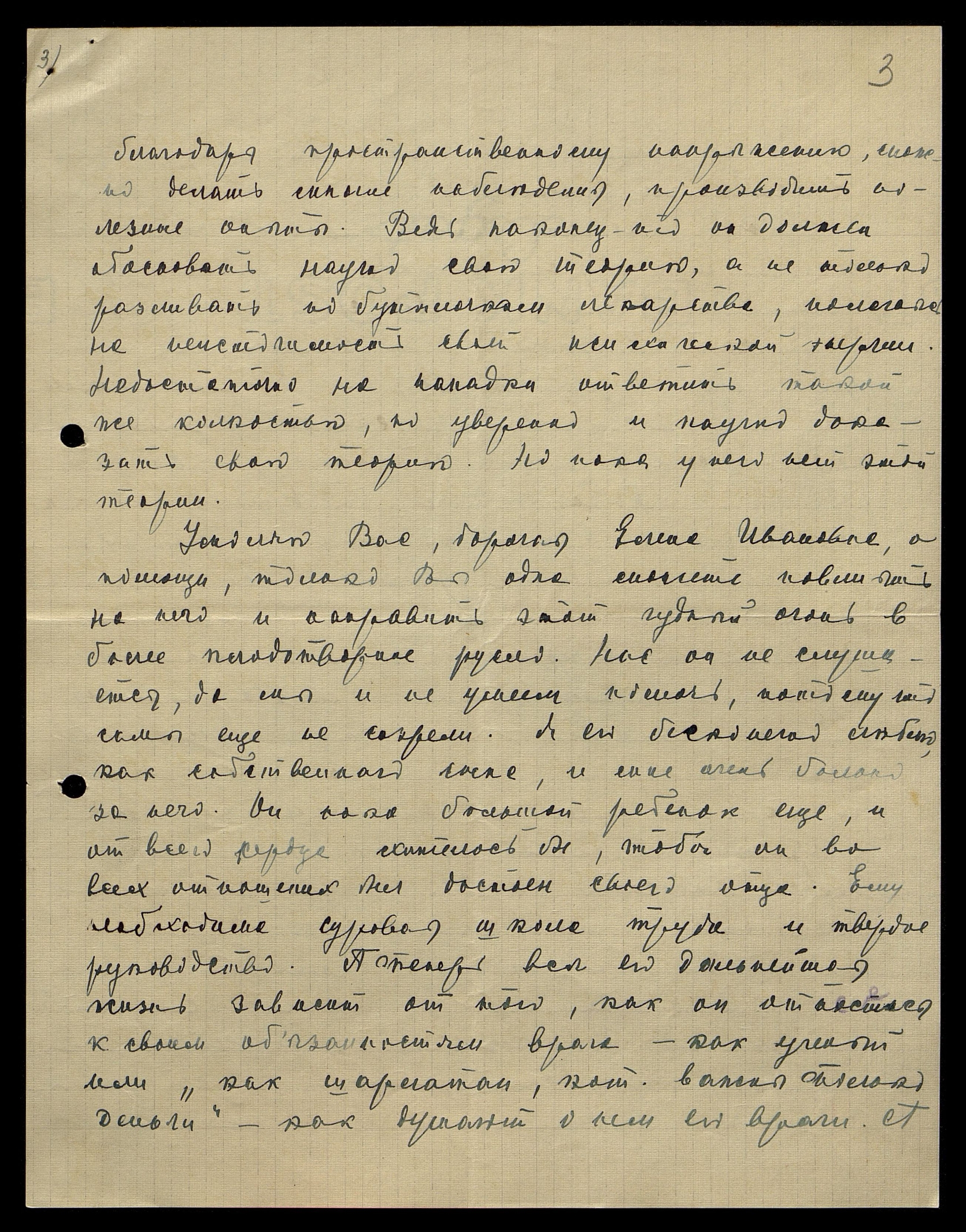 Умоляю Вас, дорогая Елена Ивановна, о помощи, только Вы одна можете повлиять на него и направить этот чудный огонь в более плодотворное русло. Нас он не слушается, да мы и не умеем помочь, потому что сами еще не созрели. Я его бесконечно люблю, как собственного сына, и мне очень больно за него. Он как большой ребенок еще, и от всего сердца хотелось бы, чтобы он во всех отношениях был достоин своего отца. Ему необходима суровая школа труда и твердое руководство. Теперь вся дальнейшая жизнь зависит от того, как он отнесется к своим обязанностям врача - как ученый или как шарлатан, которому важны только деньги, как думают о нем его враги. А
