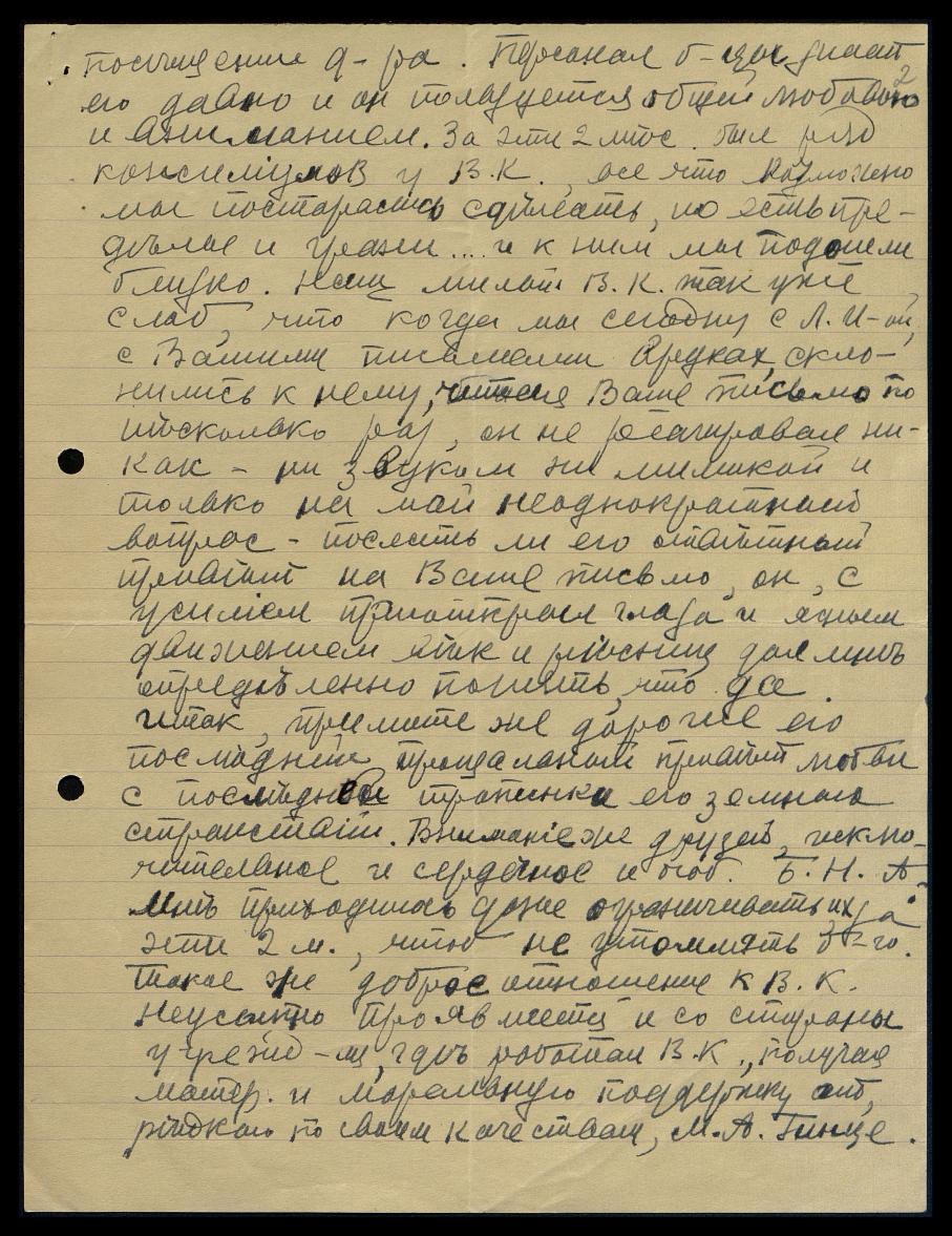 посещения доктора. Персонал больницы знает его давно, и он пользуется общей любовью и вниманием. За этот месяц был ряд консилиумов у Владимира Константиновича [Рериха], всё, что возможно, мы постарались сделать, но есть пределы и грани... и к ним мы подошли близко. Наш милый Владимир Константинович [Рерих] так уже слаб, что, когда мы сегодня с Людмилой Ивановной [Чистяковой] с Вашими письмами в руках склонились к нему, читая Ваше письмо, то несколько раз он не реагировал никак, ни звуком, ни мимикой, и только на мой неоднократный вопрос, послать ли его ответный привет на Ваше письмо, он с усилием приоткрыл глаза и ясным движением век и ресниц дал мне определенно понять, что да. Итак, примите же, дорогие, его последний, прощальный привет любви с последней тропинки его земных странствий. Внимание же друзей исключительное и сердечное, и особенно Борис Николаевич Абрамов. Мне приходилось даже ограничивать их за эти 2 месяца, чтобы не утомлять его. Такое же доброе отношение к Владимиру Константиновичу [Рериху] неусыпно проявляется и со стороны учреждений, где работал В.К., получая материальную и моральную поддержку от редких по своим качествам, М.А.Гинце.