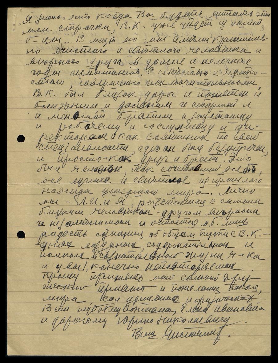 Лично мы, Л.И. и я, расстаемся с самым близким человеком, другом верным и незаменимым, и остается, может быть, лишь радость сознания об общем пути с В.К., о днях лазурных, содержательных и полных в сознательной жизни человека, и, увы, конечно, неповторяемых. Прошу принять мой самый дружественный привет и пожелания покоя, мира, сил душевных и физических Вам, глубокоуважаемая Елена Ивановна и дорогому Юрию Николаевичу.