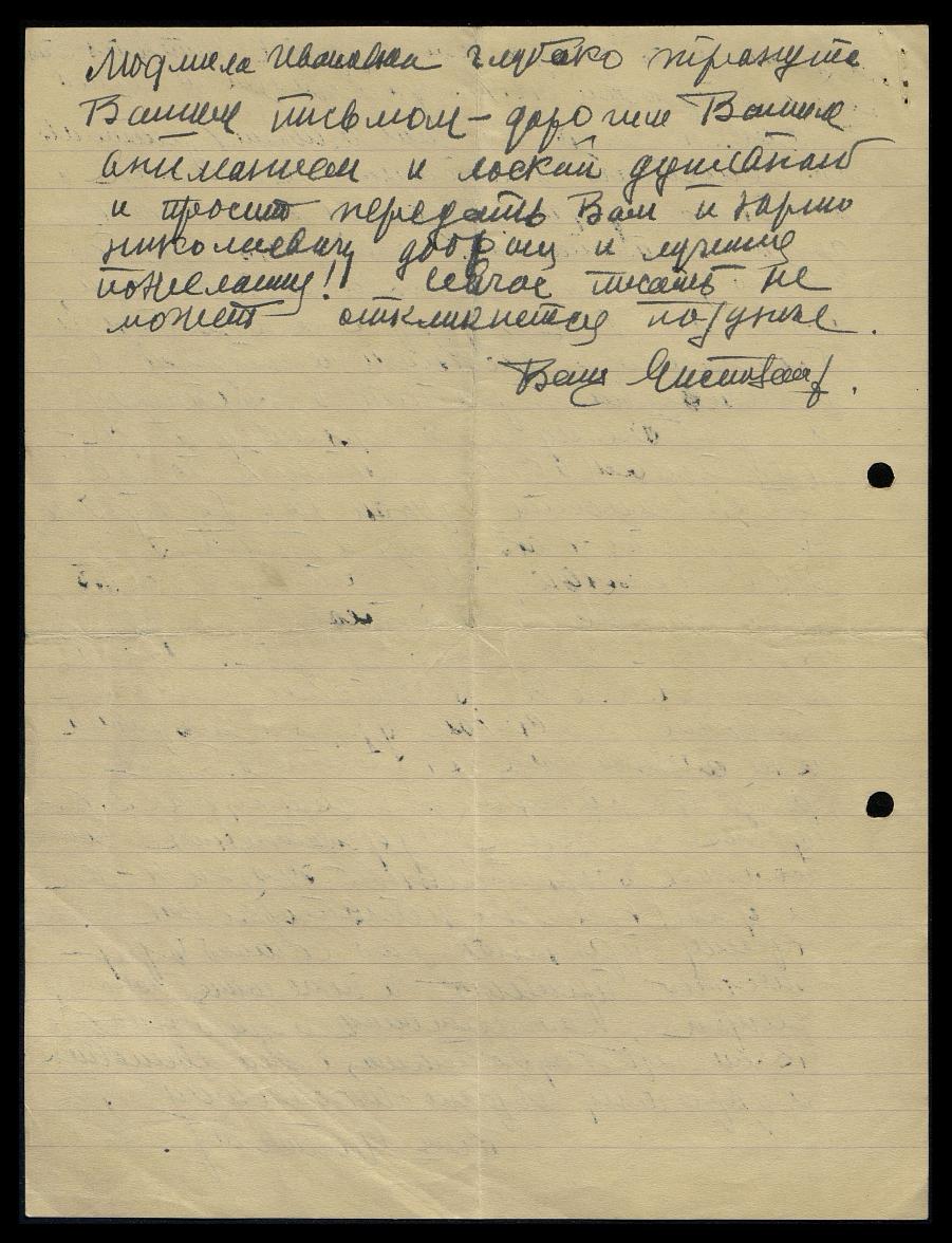 Людмила Ивановна глубоко тронута Вашим письмом, дорогим Вашим вниманием и лаской душевной и просит передать Вам и Юрию Николаевичу добрые и лучшие пожелания! Сейчас писать не может, откликнется позднее.