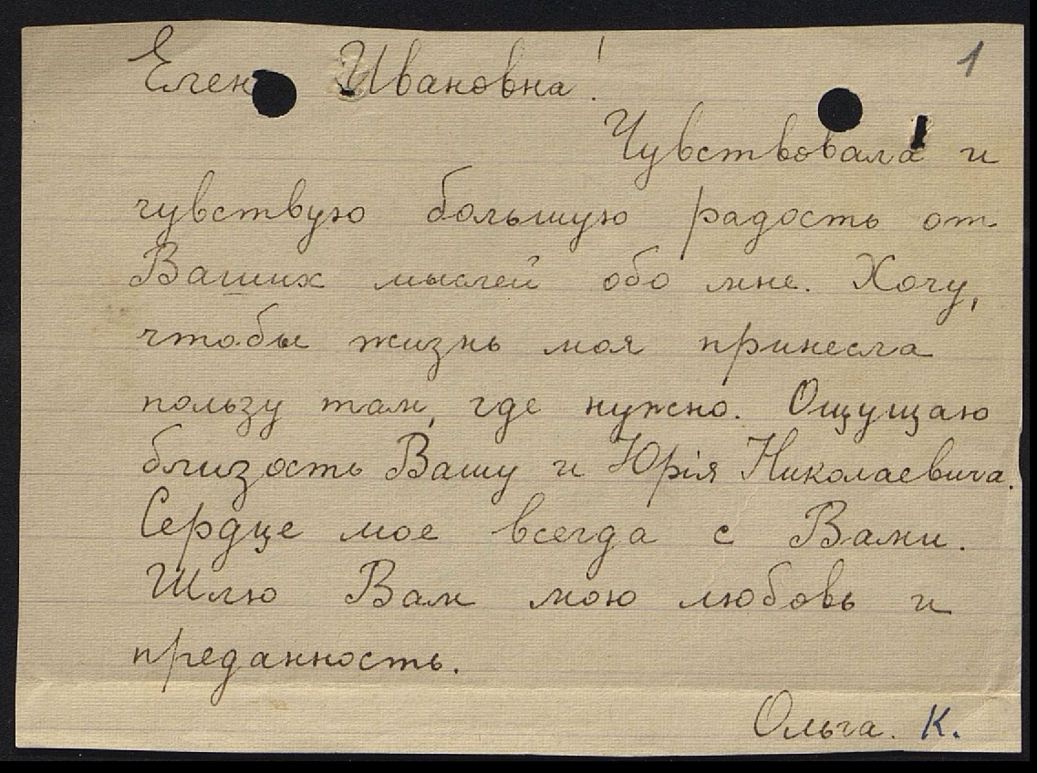 Название, датировка и формат оригинала на сайте ГМР: Письма к Е.И.Рерих Кулинич (Коренева) Ольга, приемная дочь Б.Н. и Н.И.Абрамовых 1950.12.25 русский Китай, Харбин 1 записка