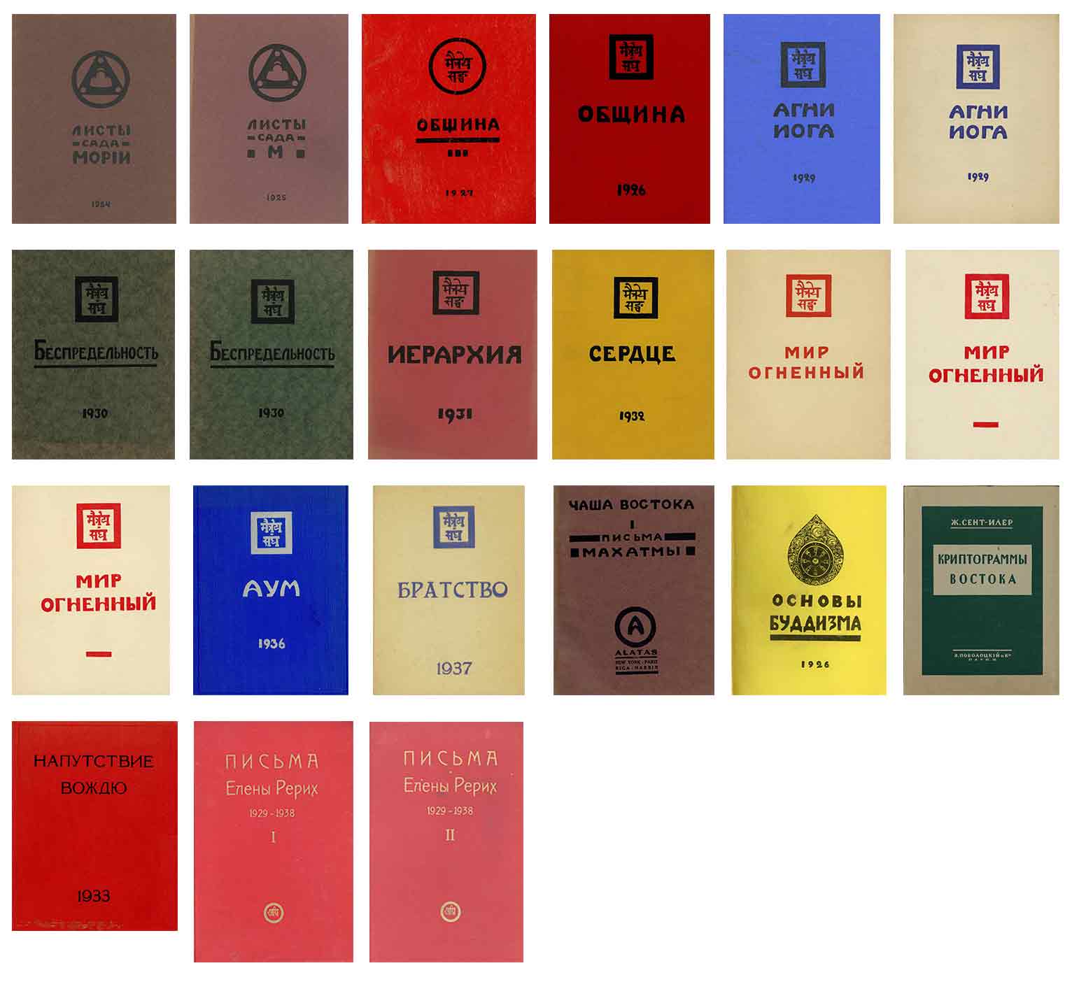 Письма Е.И.Рерих писал(а): Титульный лист уже выслан, цвет обложки для кн. “Братство” — белый, как и для “Агни Й.”, но с лиловым знаком. Шрифт хорош и в “Общине”, и в “Аум”, и в “Агни Й.”, но хотелось бы держать немного ярче, местами он неровен и бледноват.