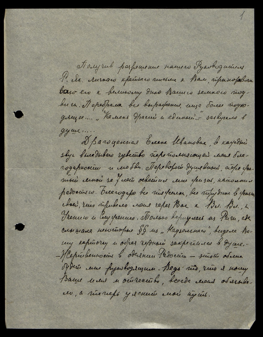 Драгоценная Елена Ивановна, в каждый звук вкладываю чувство переполняющей меня благодарности и любви. Переворот душевный, пережитый мной за 7 лет, осветил мне жизнь, всё трудное в жизни своей, что привело меня через Вас к Вел[икому] Вл[адыке], Учению и Служению. Только вернулась из Риги, где слышала некоторые параграфы из "Надземного", видела Вашу [фото]карточку и образ чудный закрепился в душе. Жертвенность в одеянии Радости — этот облик будет мне руководящим. Ведь то, что я ношу Ваше имя и отчество, всегда меня обязывало, а теперь уяснит мой путь.