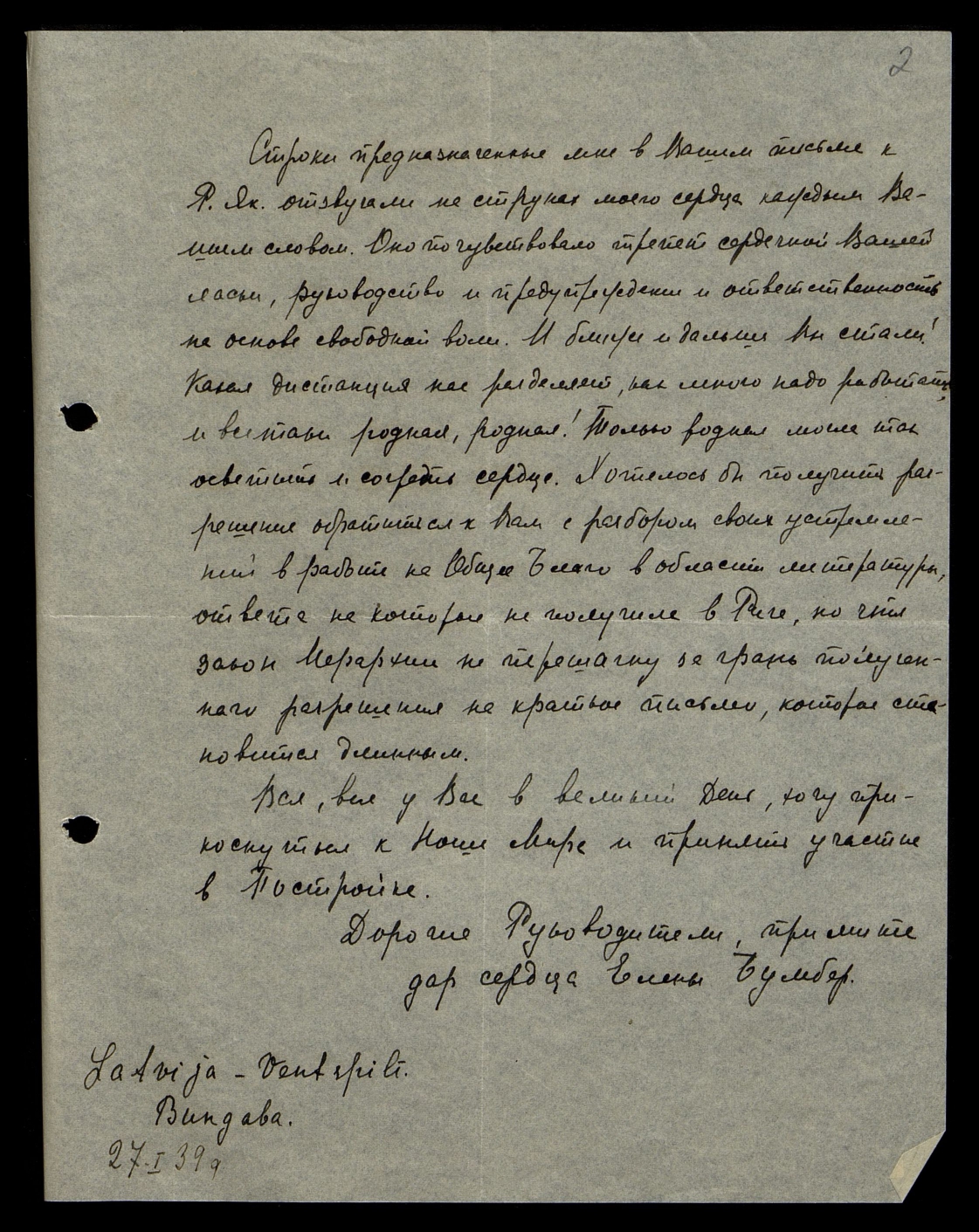 Название, датировка и формат оригинала на сайте ГМР: Письма к Е.И.Рерих Бумбер Елена (член латвийского общества Рериха) 1939.01.27 русский Латвия, Виндава 1 письмо