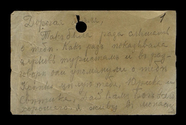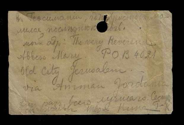 Название, датировка и формат оригинала на сайте ГМР: Письма к Е.И.Рерих Голенищева-Кутузова Нина Васильевна (монахиня Гефсиманского православного монастыря в Иерусалиме) 1930-е - 1940-е русский Палестина, Иерусалим 1 записка